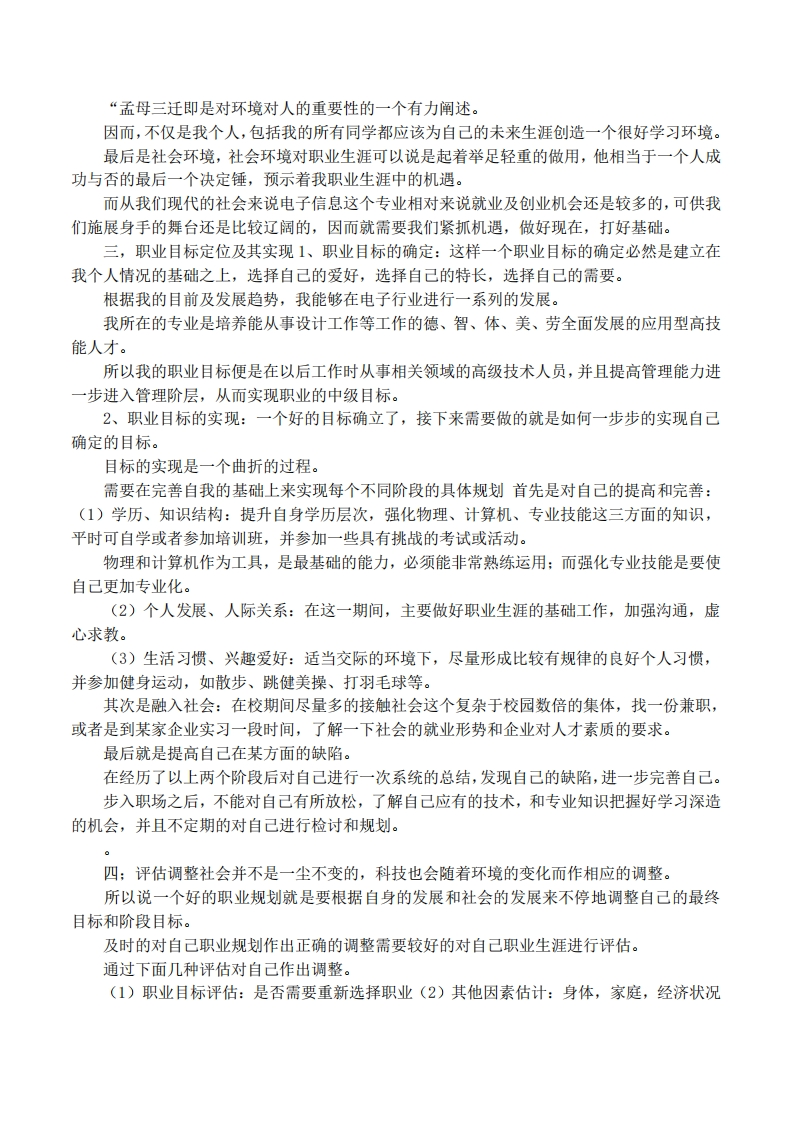 应用电子专业大学生职业生涯规划书一、自我认识1:人基本情况兴趣:喜欢在安静的地方一个人听歌,看书,打球,制作以及玩弄乐器,特长:学习认真,态度端正,在学习上对老师的讲解领悟也较快。我打乒乓球也不错也曾想进球队,但有许多原因没进到。思维方式:思维活跃,对老师上的课业常有一些创新的理念,也常练一些记忆训练,加以提高自己对学习的帮助,一旦是被我记住过的总是会难得忘记。职业价值观:目前,我是一名大学生,学习着自己学要掌握的书本知识以及社会知识,正在尝试着走向社会走向自己的未来。当前的我首先要做好的就是打好基础,增长知识,提高个人素养,树立好正确的人生观,多交益友。2:自我分析小结通过上述,思维方式,以及目前,我觉得我是想要往自己学习的专业方面靠拢真正做到学以致用。所以,这就要求我从现在开始就要认真扎实的学好每一个课程的每一个细节,打好知识基础。当然了,想要学好一门课程,必不可少的便是兴趣。“兴趣是最好的老师。但是我知道,一个人如想做好一件事,只有兴趣是不行的,尤其是对我将来的目标,不仅需要兴趣,还要学会宽容和真诚。一个人在社会当中总会遇上不能称心如意的事情,有些时候只有宽容才能愈合创伤的奇妙的效果,宽容不仅仅是容忍缺点和错误,更是一种无言的教诲,宽容是一个人人格完普的体现,在宽容的过程中自己的心灵也会得到净化和升华。真诚的力量是无穷的,人是有感情的动物,人的内心很容易被感动,引起人内心感动的因素很多,往往一句热情的问候,一个灿烂的笑容,就足以唤醒一颗冷漠的心。以前高中的时候,我们班主任常对我们说,“每个人都是一块金子,在那里都会发光一直我都记得他得话,我坚信我掌握着自己所学的知识,将来在那里我都能创出自己的一片天地。二:环境分析1:家庭环境分析:父母是农民,都是以买农作物作为家庭主要收入,但他们十分重视我的学习,对我抱有很大期望,他们暂时是希望我努力学习拿到更高一层次的文凭,从而得到进一步深造的机会。2:学习环境分析:3:社会环境分析:现代科技急速发展,会计人员需求量也是很大的。在如此发展的社会中,我所学的专业发展潜力还是非常巨大的。4:职业生涯条件分析小结:首先,学好专业知识过硬的职业技能是开始生涯以及完普生涯的最基础的部分,只有在技能优异的基础之上才能够继续进行接下来的工作:其次,家庭环境即家人的思维及对我的人生期望值是影响我的重要方面,因为在家人的督促和影响之下,当我觉得没有信心继续时,家人的鼓励以及我心中所抱有的回报家人的愿望,便会积极的鼓励我,使我重新找到力量:接着是学习环境,一个好的学习环境绝对会影响一个人。