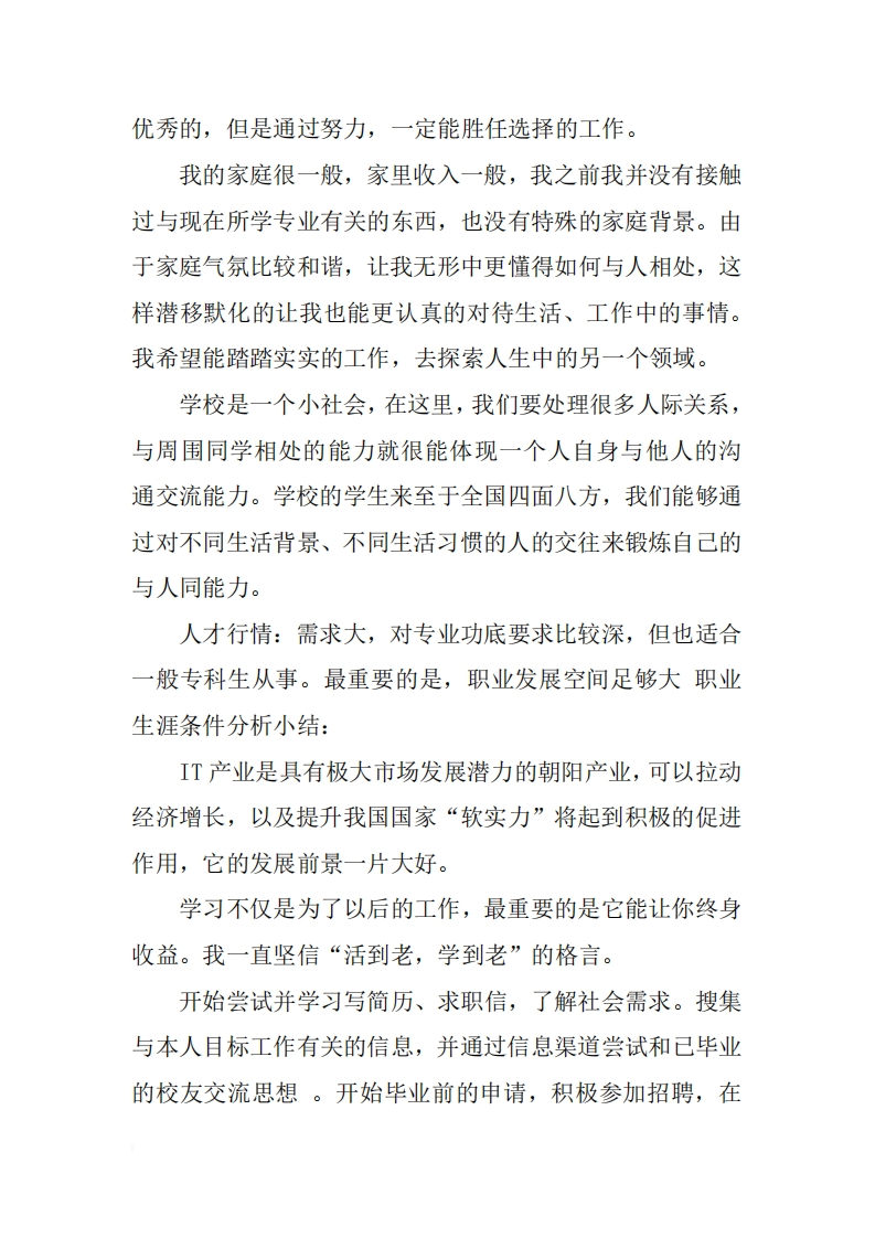 优选软件技术职业规划书别人说我性格偏于内向,但我认为我性格具有两面性,我喜欢安静的环境,喜欢一个人学习、看书。但有时却喜欢热闹,和朋友在一起谈天,给彼此带来快乐,我会感觉很开心。喜欢画画,喜欢运动,尤其是打乒乓球。也喜欢路游,开阔眼界,陶治情操。我平常的生活中较少主动与陌生人交往,喜欢默默地做自己的工作,但是在熟悉的人面前也能放宽心态、活泼的姿态与别人交流。在与人相处时,待人坦诚,往往能得到他人的认可。对自己从事的工作往往能尽心投入,尽自己最大努力工作。我不喜欢过太悠闲地生活,所以比较期待软件开发这一方面的工作,努力的先学好专业知识。我有着双重性格,生活中,常常能让人见到我的笑脸,与人沟通时不仅能很好的阐述自己的观点,也能静心倾听别人的意见。我处理事比较细致,待人比较和善,很容易博得别人的好感与信任。我并不过于的最求物质方面的待遇,更注重自身的精神感受,所以,我若是喜欢自己的工作,就会尽心尽职的去做,而不会因为物质财富的影响以致不能尽力工作。每个人都有自己的长处和短处,总有一份合适自己的工作,通过充分了解自己,了解自己的兴趣和能力,对自己未来正确的进行从事行业的选择有很大的帮助,我虽然不是最