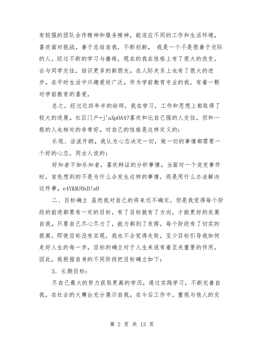 幼师职业生涯规划书范本幼师职业生涯规划书范本幼师职业生涯规划书范本前言岁月匆匆,时光转瞬即逝,从我踏入幼师开始至今已经四年多了。回首过去,在这四年多的时光里,有苦也有乐,学到的东西无论是学习上的还是生活上,工作上的都十分丰富。想想这四年前那个十分稚嫩的我,到现在临近毕业即将踏入社会的我,两者发生了巨大的变化。大学是职业生涯的起点,知识已经成为学习的一个很小的组成部分。人际交往能力、口头表达能力、协调组织能力、人格的完善、体魄的锻炼等都要上升到重要的位置。因为走入社会后,这些都和专业知识同样重要,甚至更重要。在今天这个人才竞争的时代,职业生涯规划开始成为在人争夺战中的另一重要利器。对企业而言,如何体现公司以人为本的人才理念,关注员工的人才理念,关注员工的持续成长,职业生涯规划是一种有效的手段;而对每个人而言,职业生命是有限的,如果不进行有效的规划,势必会造成生命和时间的浪费。作为当代大学生,若是带着一脸茫然,踏入这个拥挤的社会怎能满足社会的需要,使自己占有一席之地?为了更加充实自己余下的大学时光,为以后更长的路打算,将自己的未来好好的设计一下。有了目标,才会有动力。在充分认识与深刻总结自我的前提下,拟定出自己的职业生涯设计书。一、自我评价我是一个办事认真负责,既能坚持原则,又有一定灵活性。性格活泼开朗,为人坦率直爽,乐于助人,沟通方面有些欠缺。在工作上、学习上都能够团结同事同学。我有较强的上进心和学习能力,心理素质良好,具备一定的组织协调能力和分析判断能力,第1页共13页