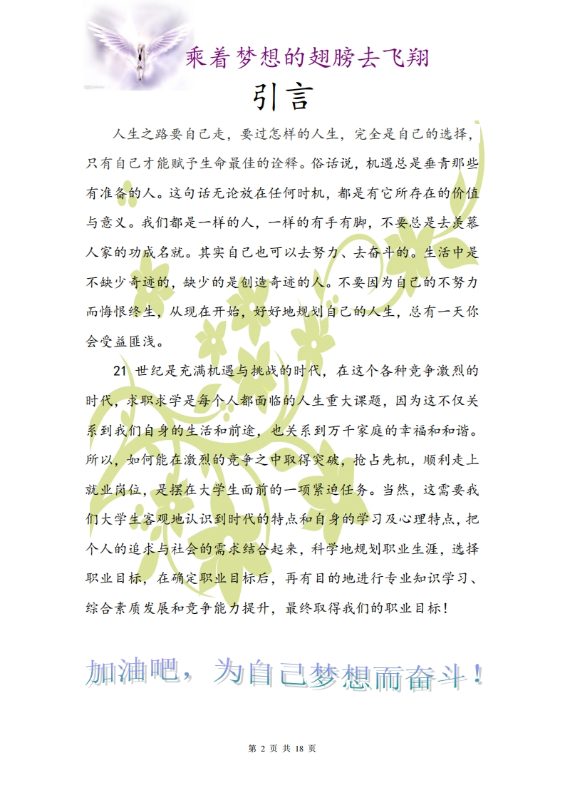 职业规划书348072@abc4个月前发布关注私信1.16MB18页033职业规划书此内容为付费资源,请付费后查看¥13¥22黄金会员免费钻石会员免费立即购买您当前未登录!建议登陆后购买,可保存购买订单付费资源 第1页 / 共18页 第2页 / 共18页 试读已结束,还剩16页,您可下载完整版后进行离线阅读 THE END规章制度 文本预览 梦想成就非凡一一我的职业生涯规划书6品.1Jump.姓名:蒋群芳性别:女学校:成都师范学院系院:教育科学学院专业:学前教育1401学号:140002061059电话:18224466710邮箱,115193599@999m 查看更多 收起部分 喜欢就支持一下吧收藏