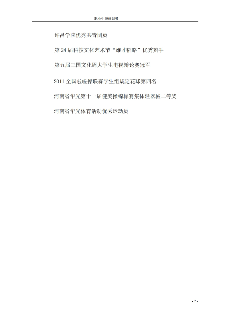 职业生涯规划书个人简介姓名:鲍璇性别:女公通营极健美操推广大赛(河南整河南省学生健美操绵的出生年月:1993年1月籍贯:河南省确山县学校:许昌学院院系:教育科学学院专业:学前教育班级:2010级四班学号:1407100429职业目标:幼儿教育专家政治面貌:团员联系方式:13733713312电子邮箱:1510958383@qq.c0m个人特长:拉丁舞啦啦操手工创意设计辩论主要荣誉:许昌学院2010年军训优秀标兵-1-