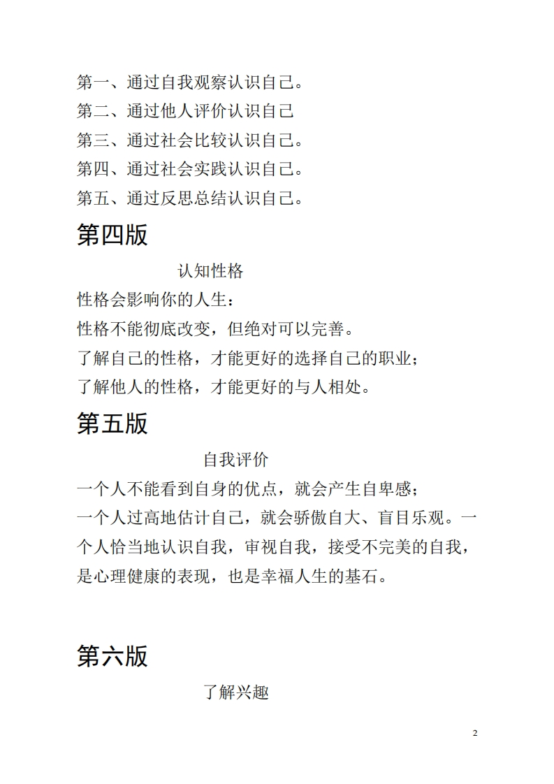 职业生涯规划板报改后稿348072@abc4个月前发布关注私信0.18MB11页038职业生涯规划板报改后稿此内容为付费资源,请付费后查看¥13¥22黄金会员免费钻石会员免费立即购买您当前未登录!建议登陆后购买,可保存购买订单付费资源 第1页 / 共11页 第2页 / 共11页 试读已结束,还剩9页,您可下载完整版后进行离线阅读 THE END规章制度 文本预览 自我认知第一版引言高中阶段教育是学生生涯中的一个十字路口:在这里,你能根据自己的爱好和能力决定自己的未来:在这里,你能根据自己的需求获得有助于成功的能力。第二版认知内容我想要什么?我喜欢什么?我想从事什么职业?我的气质和性格适合什么样的职业?什么样的职业才能让我充分地发挥潜能?完成什么样的工作让我最有成就感?我最不能放弃的是什么?第三版认知途径 查看更多 收起部分 喜欢就支持一下吧收藏
