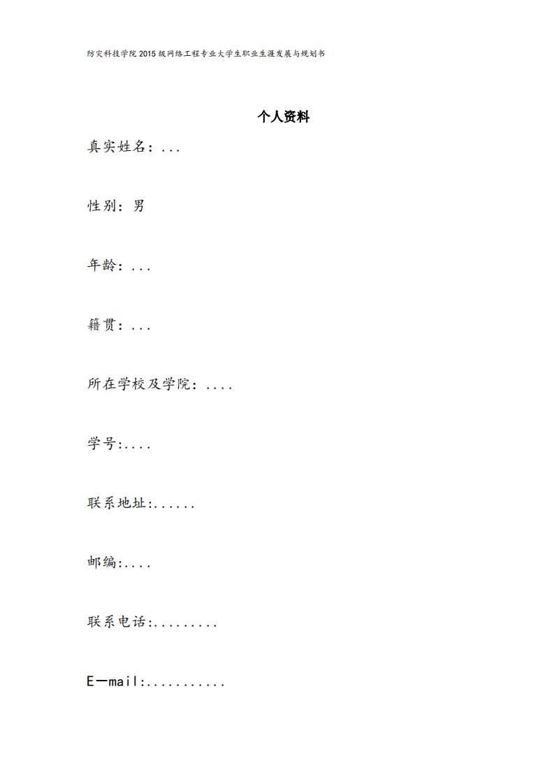职业生涯规划课-网络工程职业规划书348072@abc4个月前发布关注私信0.41MB21页020职业生涯规划课-网络工程职业规划书此内容为付费资源,请付费后查看¥13¥22黄金会员免费钻石会员免费立即购买您当前未登录!建议登陆后购买,可保存购买订单付费资源 第1页 / 共21页 第2页 / 共21页 试读已结束,还剩19页,您可下载完整版后进行离线阅读 THE END规章制度 文本预览 防灾科技学院2015级网铬工程专业大学生职业生涯发展与规划书大学生职业生涯发展与规划书姓名:专业:网络工程学号:指导老师:·职业发展目标:运维工程师 查看更多 收起部分 喜欢就支持一下吧收藏