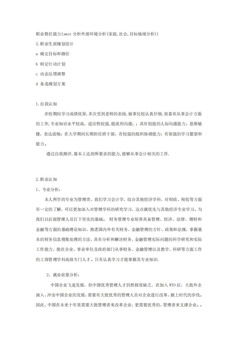 大学生职业生涯规划书范文一、扉页(略)二、个人基本情况(2007年-2012年,20岁至25岁)美好愿望:学习进步,事业有成方向:企业高级会计师总体目标:认真学习,考过会计证,和高级会计师证,成为企业高级管理人才.已进行情况:大学二年级三、目录四、正文1.自我认知职业测平内容(兴趣,能力,价值观)测平(360度评估,技能,兴趣盘点,价值观澄清)2.职业认知外部环境分析(家庭,社会,目标地域分析)职业本身的前景(典型生活,工作内容,薪酬,工作环境,目标胜任力)目标职业分析职业的晋升和发展路径(进职业的途径)认证资格从事该职业生活方式对休闲,家庭,影响