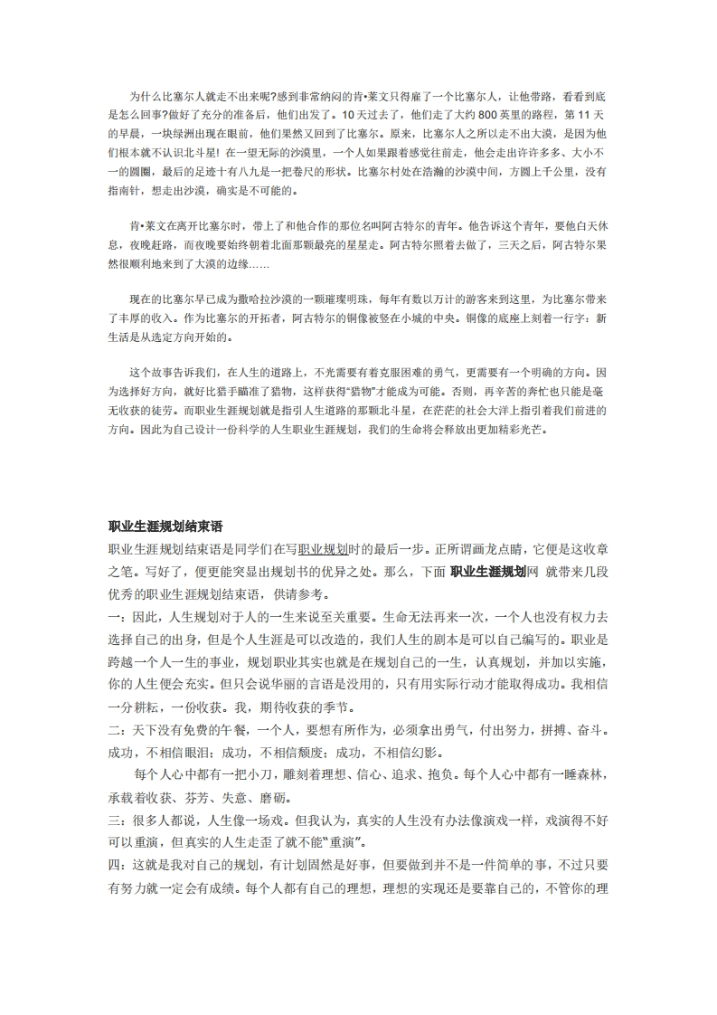 职业生涯规划前言年年岁岁花相似,岁岁年年人不同。人生就是过河卒子,只进不退!生命清单,其实就是人生计划。一个人如果没有规划好自己的人生,且不清晰自己的目标,即使他的学历很高,知识面很广,那么也只能是一个碌碌无为的平庸之人,又或者只能一辈子做别人的跟班,做一个等着时间来把自己生命耗尽的人。生命清单是必需的,它能使人树立一种精神、理想和追求。一本书中这样写到:一个不能靠自己的能力改变命运的人,是不幸的,也是可怜的,因为这些人没有把命运掌握在自己的手中,反而成为命运的奴隶。而人的一生中究竞有多少个春秋,有多少事是值得回忆和纪念的。生命就像一张白纸,等待着我们去描绘,去谱写。所以,我要策划自己的人生,正确对待自我,成功地发现自我,客观地分析自我,圆满地超越自我。职业生涯规划书前言人生如同一本书,一本自传。不同的人他书中的内容也有着不同的内容。书中可能有彩色的,黑白的图片:有繁华的,纯朴的文章:有快乐的,痛苦的情绪,等等。在书中,我们的经历就是那书中的书页,辞去了旧的一天,页码就会相应的增加了一页:迎来了新一天的同时,一张空白的纸也在等着我们去填写。而且每本书的开头都标明目录,以方便我们去查找所需要的内容。那我们人生之书的目录又是什么呢?是我们的计划。出版社一般都是根据内容去制作目录,而我们的“书”则是根据目录去填写后面的内容。在不同的时期,可以根据自己的计划去完成预定的目标。古语曰:“凡事预则立,不预则废。”想要自己人生之书内容变得丰富多彩就的先把目录写好。前言有这样一个故事:西撒哈拉沙漠中有一个名叫比塞尔的小村庄。它因依傍在一块1.5平方公里的绿洲旁而风光旖旎,游客如织,现在是一个很有名的旅游圣地。但是在此之前,却没有一个人能从这里走出去。据说不是这里的村民不愿离开这块贫瘠的土地,而是他们尝试过很多次都没能走出来。1926年,英国皇家学院的院士肯·莱文听说此事,感到很不相信。他利用三昼夜的时间从沙漠边沿赶到了比塞尔,用手语向这儿的人们询问原因,结果每个人的回答都一样:从比塞尔向外,无论向哪个方向走,最后都会转回比塞尔。肯·莱文当然不迷信这个说法。为了推翻这种说法,他做了一次试验,从比塞尔村向北走,结果三天半就走了出来。