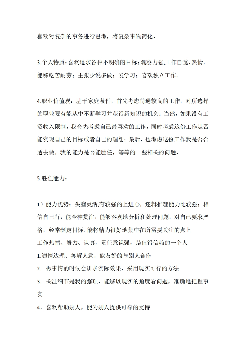 职业生涯规划书一、自我认知,通过性格测评,以及询问朋友对我的看法,得出我具有友善、负责、认真、忠于职守的特点,只要我认为应该做的事,不管有多少麻烦都要去做,但却厌烦去做我认为毫无意义的事情。我比较务实、实事求是,追求具体和明确的事情,喜欢依据实际情况来考虑问题。还善于单独思考、收集和考察丰富的外在信息,不喜欢逻辑的思考和理论的应用。我还具有对细节有很强的记忆力,如声音的音色或面部表情。另外我与人交往时较为敏感,谦逊而少言、善良、有同情心,喜欢关心他人并提供实际的帮助,对朋友忠实友好,有奉献精神。虽然在很多情况下我有很强烈的情绪反应,但通常不愿意将个人情感表现出来。我做事有很强的原则性,尊重约定,维护传统。工作时严谨而有条理,愿意承担责任,依据明晰的评估和收集的信息来做决定,充分展现出自己客观的判断和敏锐的洞察力。1.职业兴趣:研究型,希望日后能在科研方面工作。2.职业能力:逻辑推理的能力相对比较强,而动手能力也不错,比较