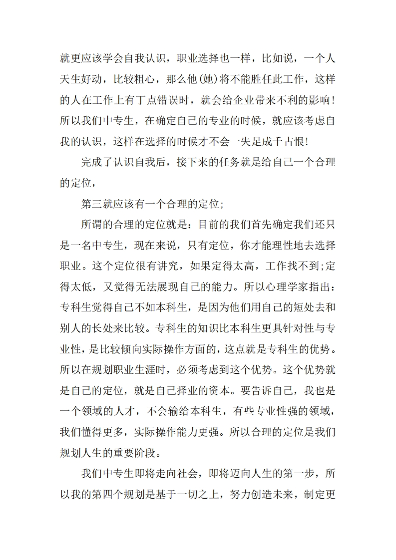 中职生职业生涯规划书职业兴趣翻有些时候,心灵的满足才真正让人沉醉!每个青年人都想成就一番事业,然而成功者是少数,多数人不能如愿,中职生职业生涯规划书。是这些人没有努力?没有奋斗?不是。不少人兢兢业业,辛辛苦苦干了一辈子,却一事无成,为什么呢?因为人生事业的发展需要技术与方法。这种技术与方法就是职业生涯规划。职业生涯规划能够帮助青年人成才,是青年人成才的有效方法。目前的我是在学习会计专业,现在的知识完全不够我的学习,所以我必须从课外获得更多的知识,从而立足于社会。要想设计出好的人生规划图,第一就应该学会确定目标;所谓确定目标就是:现在的我们即将走向社会,面临着两者选择,第一,继续就读;第二,接受学校的安排走向社会,走向工作岗位!目前,我们更应该确定自己的目标,选定自己的人生道路!个人职业生涯规划设计的基础是对自我的分析,所以第二就应该学会认识自我;所谓认识自我就是:目前的我们即将走向社会,我们首先要知道自己的价值何在?自己的能力何在?自己的特点何在?自己的兴趣爱好何在?自己的气质,修养何在?所以我们