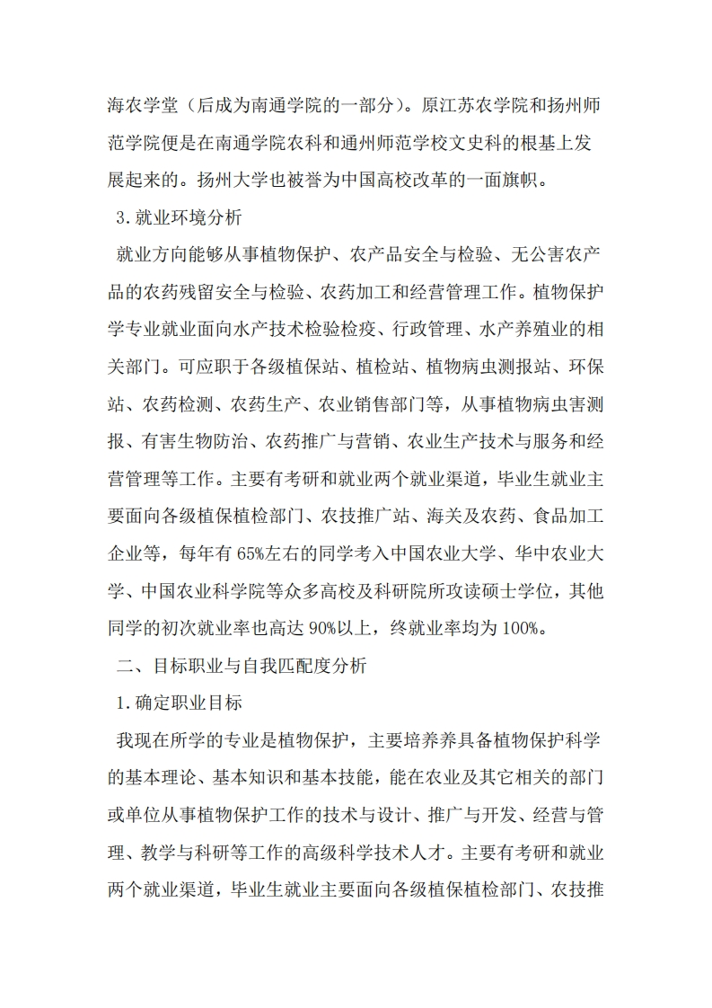 植物保护专业大学生职业规划植物保护专业大学生职业规划一、自我分析为了家人的期待目光,在学习方面,我认真刻苦,懂得运用各种途径获得有效的学习方法,学习成绩也都不错;在处事方面,我的原则是要么不做,要做就要尽全力做到。在待人方面,我常告诫自己应当做到“律己严,责人宽”,尽的能力去帮助别人,只有这样才能获得他人的尊敬。小时候梦想当科学家,懂事后不敢想了,然而现实似乎又逼着我想着科学家迈进!我也就放手一搏了。做好规划,稳扎稳打,成功只会给做好准备的人二、环境分析1.家庭情况分析我出生于X年X月X日,像许多九零后一样是家中的独生女儿,从小就是温室里的花朵。但是,在家中我孝敬父母,尊敬长辈,待人真诚,会为家人分担家务,有着较正确的价值观。2.学校情况分析扬州大学坐落于长江、古运河之滨的中国历史文化名城一一江苏省扬州市,是江苏省属重点综合性大学,是全国率先进行合并办学的高校,1992年由扬州师范学院、江苏农学院、扬州工学院、扬州医学院、江苏水利工程专科学校、江苏商业专科学校等6所高校合并组建而成。扬州大学的办学历史早可以追溯到1902年由近代著名实业家、教育家张謇先生创建的通州师范学校和通