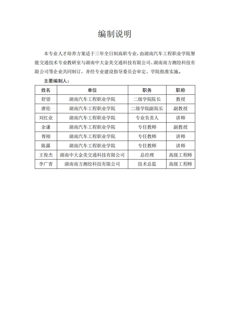 智能交通技术专业人才培养方案348072@abc4个月前发布关注私信2.44MB70页037智能交通技术专业人才培养方案此内容为付费资源,请付费后查看¥13¥22黄金会员免费钻石会员免费立即购买您当前未登录!建议登陆后购买,可保存购买订单付费资源 第1页 / 共70页 第2页 / 共70页 试读已结束,还剩68页,您可下载完整版后进行离线阅读 THE END规章制度 文本预览 阅阴有汽事上行獬掌单院HUNAN AUTOMOTIVE ENGINEERING VOCATIONAL COLLEGE智能交通技术专业人才培养方案专业名称:智能交通技术专业代码:500207适用年级:2023级专业负责人:刘红业制订时间:2023年6月 查看更多 收起部分 喜欢就支持一下吧收藏