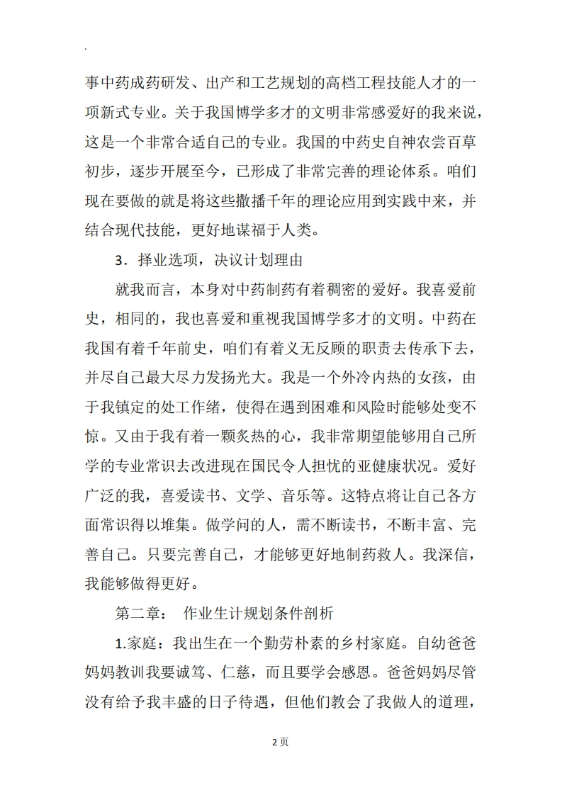 中药制药专业大学生工作生涯规划书导言在今日这个人才竞赛的年代,作业生计规划初步成为人才争夺战中的另一重要利器。对每个人而言,作业生命是有限的,假如不进行有用的规划,势必会形成生命和时刻的糟蹋。作为今世大学生,若是带着一脸茫然,踏入这个拥堵的社会怎能满意社会的需求,使自己占有一席之地?因而,我试着为自己拟定一份作业生计规划,将自己的未来好好的规划一下。有了方针,才会有动力。第一章知道自我1.根本状况:我是一个大一学生,性格内向但有时开畅、生动,业余时刻爱听音乐、外出漫步、谈天,还有上网。喜爱看小说、,特别爱看前史类的书本,平常与人友好相处群众基础较好,亲人、朋友、教师关爱,喜爱立异,对工作有自己的观点。我的优势在于我能够常常反思自己,哪些做对哪些做错,以及怎么完善自己的品格和重视心理健康。懂得劝导自己,并以己推人。己所不欲勿施于人,己所不乐勿加于人。2.作业爱好:中药制药专业是培育把握中药学根本理论常识、中药编造加工和中药制药设备的根本原理、出产工艺及根本常识:具有中药新制剂、新工艺、新辅料开发研讨的初步才能的从1页