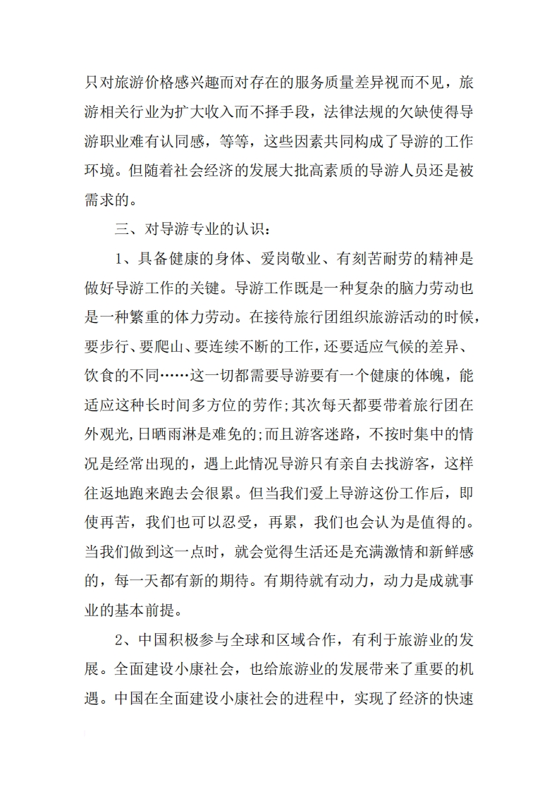 中职生职业生涯规划书旅游专业美好愿望:事业有成,家庭幸福职业方向:开一家旅行社总体目标:完成大学阶段的学习,有自己的事业。1、社会一般环境:中国政治稳定,经济持续发展。在全球旅游事业发展迅速的形势下,中国的旅游事业也在突飞猛进的发展,逐渐从以前的中专水平一大专水平一本科水平,更甚者可以出国深造与国际进行交流。2、导游职业特殊社会环境:由于中国的管理科学发展较晚,管理知识大部分源于国外,中国的企业管理还有许多不完善的地方。中国急需管理人才,尤其是经过系统培训的高级管理人才。因此企业管理职业市场广阔。要在中国发展企业,必须要适合中国的国情,这就要求管理的科学性与艺术性和环境动态适应相结合。因此,受中国市场吸引进入的大批外资企业都面临着本土化改造的任务。这就为准备去外企做管理工作的人员提供了很多机会。3、导游的工作环境:导游变导购,其行为成为旅游者与媒体关注的焦点,成为被指责的对象,这种局面的出现,应该说是与导游的生存环境分不开的。旅行社之间的残酷竞争,并不富裕的旅游者