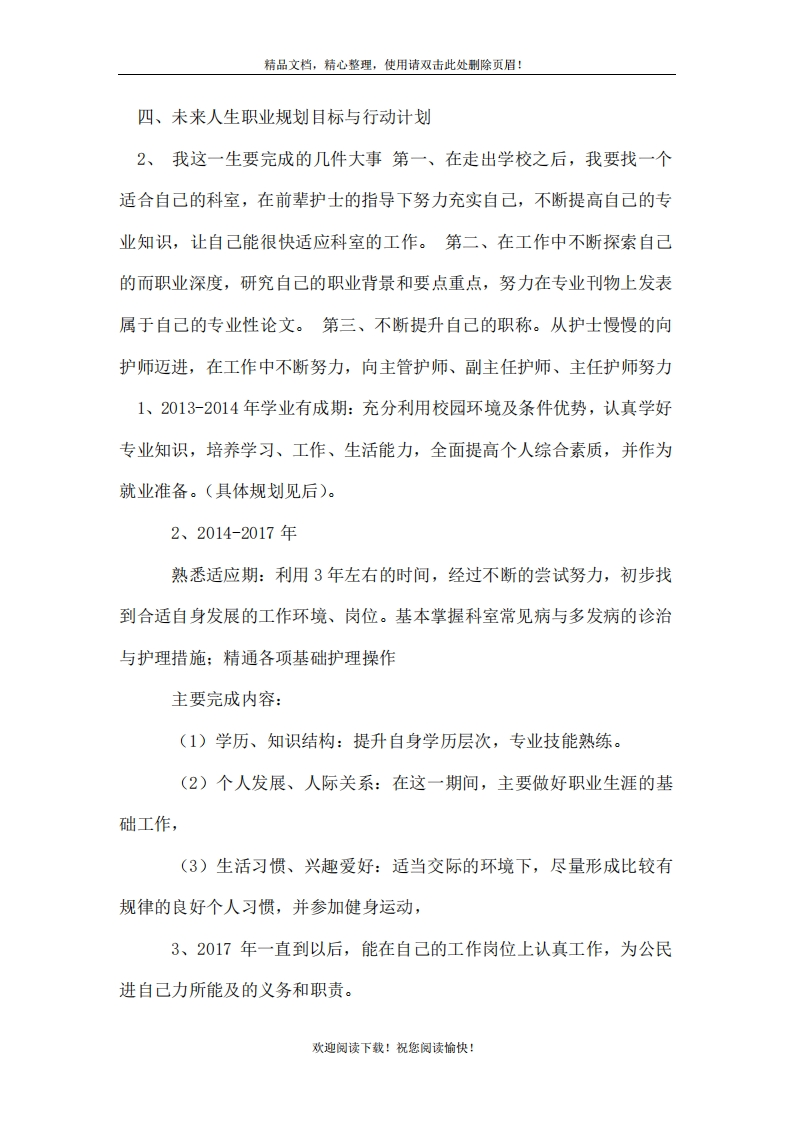 精品文档,精心整理,使用请双击此处删除页眉!助产护理专业学生职生规划一、前言(略)二、自我评价我是一名助产科护理科的学生,家里最大的期望就是希望我能考到护理资格证,成为一个助产人员,有个好工作稳定的收入。我性格乐观豁达,做事目标明确,但是不够客观,较主观:处事比较保守:缺乏临床实践经验:技术操作不熟练。我会在成长的过程中克服自己的缺点,认真向经验丰富的前辈学习,近一步完善自己中国有句古话“江山易改,本性难移”,有恒心是不够的,但是我可以凭借那份积极向上的的热情鞭策自己,久而久之就会慢慢培养起来。经常锻炼,增强体质,为今后的护理事业打好自身身体基础。在我选择护理专业的时候,我就梦想着自己能成为南丁格尔那样的人。让护理事业因为我而变的辉煌,变的灿烂。让自己的护理生涯变的更加多姿多彩。三、内外环境分析当今社会,医院都是以科技为先导、以人才为基础、以疗效为根本、以服务求生存医院聚集一批精萃的医学人才,医院中有护理组织发展战略、护理人力资源需求、组织护理队伍的群体结构、组织护理人员的升迁政策等等。作为新世纪的护理人员,应该要有扎实的知识基础和熟练精湛的操作技能,要有严肃认真的工作态度,积极向上的工作精神,努力做好每一项事情。然后综合自身的各种因素综合评价,确定适合自己发展的机遇与空间环境,准确把握自己的奋斗目标。欢迎阅读下载!祝您阅读愉快!