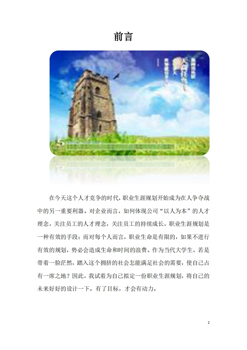 目录前言--2页一、自我分析11职业测试111霍兰德测试--3页1.1.2卡特尔16种性格测试-4页1.2360度评估-5页1.3动力测试如下表-7页1.4BTI人格理论-8页1、5性格测试--8页二、职业认知2.1家庭环境分析-10页2.2学校环境分析-10页2.3社会环境分析-11页2.4职业环境分析-15页第三章:职业定位3.1SW0T分析--16页3.2毕业选择分析-17页3.3职业路径分析-18页3.4职业规划目标-18页第四章:实施计划18页第五章:评估与调整5.1评估内容-20页5.2评估时间-20页5.3规划调整原则-20页结束语一21页1