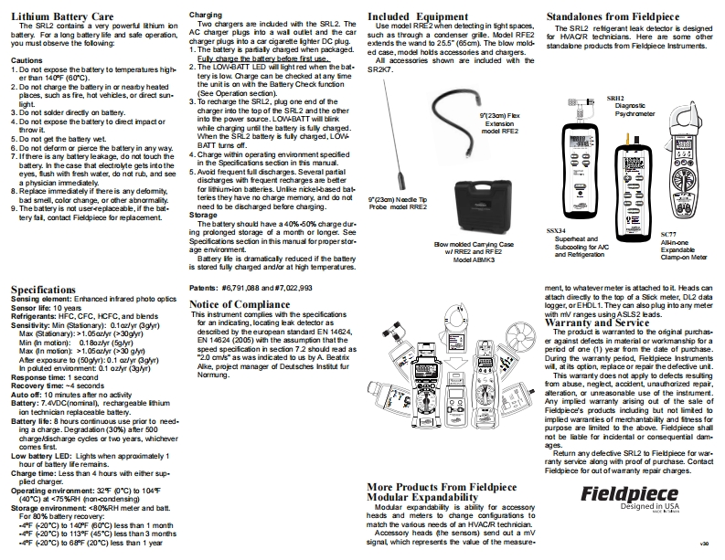 InfraredDescriptionQuick TipsComparing Leak DetectorsRefrigerantThe SRL2 uses infrared opfcs to creale a1,Keep the wand Sp moving pa时pec轴dekFieldoiece has to leak deteclors.portable refigerant leak detector echndlogy tatbcationsThe SR2 uses an infrared0风$a0t.Nd比c地Leak Detectorhas a superfor combina fon of sensisvity.speed,a CHANGE in concentrason,so the wandModel:SRL2se0r色,b3ye,port由bility,and e3seof处2.Once a leak is deteced,sweep the wand backmust keep moving.The m血advanta的safeGas is pumped trough the tp of the wand inter船pGlFeldpiece IR sensor are thatits senstity wilthe sensor within the SRL2 body.The sensoremain the same over the lfe of the instrument.delects changes in concentrafion,not absolute con.3.To pinpoint larger leaks adus时g1场dyre绝0rwdl超到he lfetime of the instucentra fion,naking it e3y帕de能ct leaks even inment,it will not trigger on humidity or on oil3 eas with refgerant肌ieFilter Assessment Replacementand it has neadfy te same sensitvity to mostThe SR2de能cts leaks as$Ta■s0.1oz小eThe flter blocks moisture and other contaminantsefrgerants.The main disadvantage ofinfraredwhich exceeds the loughest SAE J1627 standards.from the sensor.When it gets wet,i constricts fowsensors is ther sensisvity to mecharicalTheS风2 comes with wal and car charger的rsof ar and i wil have to be replced.Unscew thefs尚1心sultra-compact Lithium-ion batery which powers thesensor Sp and replce the white flter so that theThe SRL8 uses a heated diode sensor.S风L2和f1sdc0 nfnuous operation before arounded end is dasest to the tp of the wand.UseThe heated dod3 dvantage飞hat it de触csrecharge is needed.Thars long enough to last youronly the Fieldpiece supplied fier.osh触c0ne法ntra ion leve&0 it can be held onerew灯kd超¥You can order from a distibuor extra bags ofa eak and will o的rnue如bep.Itis also nifallyUnike many leak d抛ecos,replacement parts (model RFL2)are available from出y绝f地.sfad小vana的se通efgger the SRL2.Fieldpiece.Model RFL2 contains 10 flters and 5 O.i0b8c0Tmes梦g们te0gfe,eanaThe SRL2 hasneeding replacement and it is moe sensifve toable sensititysome efrgerants tan oters.tings.keepingsance tipping”0aminimum.Aquc这nda的mfc308c0 d sefcalibra0nup0np0ww地-tp△WARNING△ensures opimal per的mce.A bult in rep的ceablefier blocks moisture and harmfu pariculaes.TheDO NOT use the SRL2 without the proper flSRL2 asohas a mute button and a peak hdld funeter comectly ins超edtion.OPERATOR'S MANUALOperationTurning the PEAK funesion off wil dear the peakThe most likely points for refrigerant leaks are at4.Returmn the fp back to,and past,the spot firstchange.The PEAK LED will light when PEAK fune.the soldered joints in refrigerant lines and changesindicaed.When the SRL2 indicates a secondON/OFF ProtectionSon is on.im位s梦地cion or drection of thes地ns.cgg色,note the spot on the line.The0 urce ofTo tum onloff te SRL2 press and hold theThe SRL2 detects changes in concentrafion ofte eak will be near the midpoint between theTurbo Modereffgerant,not the absdlute concentrason of reffg.to noted spots of indicaion.ON/O