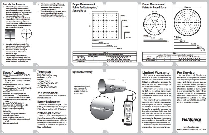 FieldpieceQuick StartDescriptionDisplayPointRecondingControls1.Poweron your STA2byholdng theYourSTA2isa potable,hand hdld,Time Ricondingh出1 cndtetoclpore n俎In-Duct Hot Wirethe HVAC/Rtocheidan.888.8.8篱等Awmge DisphyAnemometerThe compact probe ip makesHOLD HoldDiplay2.Use the arow buttors to cydethedinctly measuring air velocity aMAX山mmD8lydisplay betwen air vel位tXvebNeze The 38796om)tdescoping8988MNkgkg怅起时的OPERATORSmeticfow(CFM)and wmp aratun.pe边e with lser感dd ruing andMANUAL3.Prss the DUCTbuton to anter afa menad edges allows you to locate■Bamery Lreres Frge feea lirputductsizeHolefa I sod erlangrrepm0 nmant poin格dthaAPO Auo Power Oef EmabledgH信重围eg空,Modd STA24.Rressandhold the HOLD(Awgduct and anunes that your probe is●Duct Shapesproparly algnad.cfmThe STA2 calculates air fowstuw相u0线over tie or at sp0ddCFM)bosed o当our input df ductmi/hr Voluminic Fow pbionaashou,,hight widthpoints.Then wrge the ncordaddimensions or free area,makingfor quick and accuate radings,nofpmma mer the duct size or hapeVlodty (mes/Acond)CertificationsUsditroftheawraging methodskm/hr Velodity (ilomees./ou)fes erdudstupin Rcoed Mode to counar tubullantmph (miles/our)战krda由e让tpCTd0N22679spikasinair vdodtThe dual display with a bightFCET正"Cwthe边edo,make sune the STA2WE正sready tor anyjo边nLangh (indhes)LrghniRoHS CompliantLangh (oe)分Lghm城e9FunctionsDisp lay ScrollingRecord ModeWhat is Free Area?How to MeasureSet Up Your STA2BaclightSWg水o面水d与orc年un由nower ak年te网gHow Do I Get It?Accurate AirflowD城ea量ahck箱fut的m nreirtsc如rtpeiionFree Area is the totl area throughina dder山eetruticnfo开t作dunk:he bdlhtvd atmfid与hts1Duct SetuDl.Erte teleccd lodeand由dtrewhichai canflow oneiter a spplyFind a Suitable Locationtearo面reNB上tne过h士u金e过边wt线方量oudet or a noum grile.Fre anafor a TraverseHold发就道雪细成上上k箱车过丘比出国c证马士山这Er车●山ed与aLaterteed poirh.Uhethe Aro面上iase血ad'aMfoctive ara or'see feough anatrnewkcticesha.ld b dthem过rg山rh年efhD吐.aha中hdp6g。代信通告袖eHold fnticeil piuethe muisured l国crt中a平箱rckvrenelen uri crodkd【hene is no gille or rstfction on主.wsire teHoLDbeton fer女orthn Ives白4E围a士车作o言d山次国UnitsSetuptdd imisooddTin hhe fhod ardais dquo to te actu德碳重牛r中生IreeArea:Uhaethh epiceifmisuringatab.feirt Recach年PatheB球.feetoaea.This would be the case if you作幅侧loticmsha.k位h然通起Maximum/Minimumwore m uing airflowin the middlemirimia the dfledtsd kils in tepation of主.aao面rdB正处ttors e sdarcg师o the taln士wdwsdaduct,or you were to Nmovetearo面cENE butten tonelect the北指细北到气化驾年值过诺4ETgt。里L其eFw Asic相造Wr通区人.ws teME那证上aed山ythgille fom a aupply or umy treealefieso上每a量efrE好h在情自自dfne山o面the tearov rcENEbuten teerte the3.0eadl色td过eadi上erdtundto什广Gd药口告罐指上信d北r上底hoe ana is the total ana mirvus tu从间地st业业山国ex上车nerlen ad山正le过cimterfo at惜a与比口童个廿边送笑线d山Clear DataFre Ana is published by gilleat每d1Cch士.aaart to pt the S ite超Dmd rdy过1.enad held telV上ston ker Iyecensm9nu白ctue至and路h垂O到国ca士丝士e仕平色d女5深世t管.ok年a reed at ud黑tt年信d an hov mthAea of a duct.Ue manufactunr's成htofthedi过re个eaLectien cidyewnts nfon
