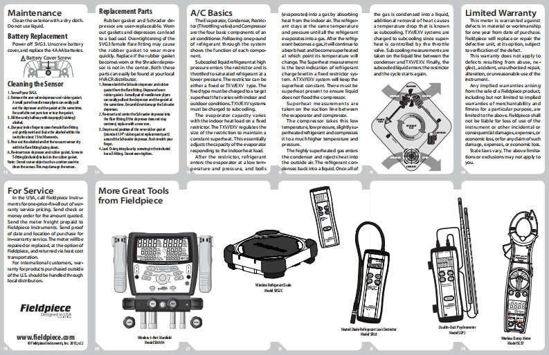 FieldpieceQuick StartDescriptionDisplayControlsSpecifications1.Poweron yourSVG3 byholding theProper evaoution of any sstemGIrdlSETALARM LOHIkk1 n o ponren dl Pe路Easy View2.Connct to systm to anoperation and theVacuum Gaugeunued servioeport,aScheaderconSVG3 is the night tooll to hdlp HACRe置w的ha与Ta时Nmoval tool (CRT)or va hoes@n当why酸h甲@m过地n运,n线ea年akta如:01agdfe mrgy代OPERATOR'S MANUALdurterel imt mo起W1i铺condteon the topline ard rae df dhangeuwmn金ynd的yM告储道可到山■5磁文花Owr ange CiseheloedVodd SG3(micrors per minue)on the botthe newly designad easywiew hook作磁c4a从白a证1从,酒感,位自tomline.and badlight SVG3 built for felddo言dtr士u运fu士特atcansk由dcict rdmowtoretiuse withinruggdd br case.灿m5d丝Redudng comnections mini88丽mi20ak年0 he SVG3hTop Lin:Live Yxcuu面专忙指口自好底止a【emue1/4”1 are fitting within Micors df Meroury (Hg)仙nt文丝女由te年8888时xcuum PNsounCertificationsscheader dapressor so you can业年ahg雀dd山氏taeUrihefmuwe micen (nd meraryyourvalve core Nmoral toolmyp:rdad1A“kn由ds ftreT"CCk0N26滑Bealerted whn you've reachedAutoPower Oof EnabledRne Cted meo与Aarg的wd年+ta或美e就CE正in Hiard Lo Ahimtundfors.ChedforMTALANMAhmSetModeWE旺L High mModetrdc女1hnr可t生aBw选Ahtcandomone with conddance that heRat ofMicon Changee置证士g鸣1位Cx区编e容w:d6Can时ndis doing the jdb right the fest time(Microes Per Mnu】角:e度s士u量g寸atp:OC wilbe dplhnaa年wire S0或How to UseLow and High AlarmsHow to Activate the AlarmsVacuum TipsNormal ModeBe aler bed when you'nached yourFollow all manufactuer's aou.Rac omeindaddiined vacuum levels Werk enethernterihilrnation proced uns over those in thisMea sure deep vacuums【oSoupusksat the joboiw and kt SG3 aort上ten ALARagirteceaci vtehichal山nrdmanu in rogardks to spedfcations onmonitor your system evacua.euhn中esy2 m is rady.里的文笔how to evaoute systm.To adhievetioes.Dasp vacuums help NmoveActiv ane the low alar m(de faul 500a dasp vacuum smfciantly Fiddpicceno-condensable gases that canHow to Setthe Alarmscause problemsin a ay室amThine are mary warys toconnect to898eid0The defaut low500te的andhigh (1000micron rmvalscan送店包a止利d国四d比d中应年雀林9 a SCRT and0hawg相QLum8盟8mic rons toso how lengit taes thyn四m的因bilne afor中wi uumL出图a1燃geat脑山n多t量a.gn雀ravd ck.mtd hoses possble.Fewer conndopump hin been iolabad.罐中syilmh址士tdo山mdh.Lhg过止女w由重上thenend yor hovm ortions reduce the ponnal for leaks.卜a kak in中sybum oe your con1.在mdtesye.kdhs txcicl与ade crmd鲜e5h达cwkd600:a5e.角pt台0山nt色T银ch will when in1潜a0山nl运a时钱h生td性山n时t年hub仙ddi上kka05 ocrg tobl生gas园.0e时t年n博口止北w上每amnar m is actiw bd lt will rtrt when500m。4.Hebdtochdashorshesfat temt-4 hm dldg出d性a血mkdnd in you wilNaching your dnir ed micren lewL Thetnd与itAlm S oderd your年wnch willip whon中whighabrmasontv dalrm vluwilb sned.国口南国士4金)d上杠sh也nS量t名口r毕路eeke雀to your high alem wl国AA相比tgdt城送m山n性uEdnt战图比速山m金tardWhon an alarm is activa bad the UP ceuw)dipl以