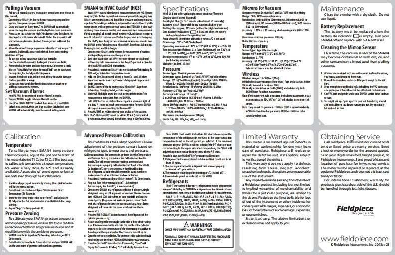 FieldpieceQuick StartDescription1 Fower on your SMAN4 by holding the ON/Your SMAN4ishe frsttrue we desnobkdMkPaMkPa4-Port Wireless4-portmanfoldandvaouuminHg2 Selct deshed uits (English or Mic or acmHgManifold Vacuumcombina tion)byholding ENTERfor Isecond.warrmineeslikeSOP2Dullin-DuctPsychrome trP0●033Can0 cthoses and电0山mos to tsysmof0 iv tmgora tune me unmen格ar中-4与Gauge4 Press the droular button to selct bitweanair for ral-timegN parhaat cakuhtoActul Superteat and Subcooling TargetoWN4 anwidessyy sandd山tato theH田Negrtive Rrespune (inches ofmroury)Noga tve Prsaure (nches of meroury)OPERATORS MANUALSuperht Dnct Temper anureDiplay(TIT2H偶C Gude for more extersive analyds,d山白Negitive R essune (om ofmroury)Negitive Pressure (om of meroury)Modd SMAN4Your SMAN4 combines high predsionODDBCertificationsvaouum,and d.ol wmparanune masrernts中是道m TIDNaHH:MM:SSino one dasyo-ue instument Your SMAN4T白por Sa tuation Tamp0auwFCCID:VEARP915superheat and actual superheat to werifyproper charging of a unit our SMAN4's 4-portStableset口口口0Oundoor Dry BulbT1-T2HiLox山山mewa里h是C-Tik(N22675bore theoughout the blodfor quidrcovryMoron Raadng HsStbliaodand.Set Mode-口00口0日金安mRoHS Complantof he HVACR tocheidan with a ruggedzedhouum (Micons of Maroury)Batxary Lite e0 c ton50n9西t地r boot for duabilit%a strong met白lT thermocouple.D2thermocoupleAuto Powor Of Enabldnsis ant,paddad nylon pouch.Sdecd Refiger ant ofSysmControlsFunctionsSaturation角t5城pet discl.l址d rcloted台oa手erd0能rat,车taA队1tht moca时etothe scdtacm然0 oe wdne h出spesE&fh年utSuperheat and Subcooling1安aTarget Superheathn适erur点年h思1shaded fom山过peh4rd匹士smtina本Targ Supeheatis only usd for chargingfised aifioe正u由n址o wohedwirdeal水1过tau年epierdigurtu止车a出8ALaa撞g第维s.Your SMAN allows you0rw通ereal-time indoor wet bulb (DWB)and oundoor dry bulbch口r言金包fa4国n金i止k teuritisponm的年者十d五山量e有t销忙Ce平室u音s000 mperunes virek0tda山餐aroa superhut.Duing ter4由te DS er00笔ens南ods过业the aren whdan区女t车saaaleohy tea dfeert Rielprortanntrbstmindertry1 Inset bpe Kthemoc年le plugsherepirhat:Ha其teb水thoe b id每lmw包oonnc ing the inc ludd wet and dry bub them ooouples to T2Krosbu dtrniopondT卫居军di休Mcwo精Bnd的越w年nbunn vih由dy甲ahh止起er北cd6die山动档导解1 Pesdmlr hterurd yo'verteed lce med.es-uleeite能a心0 pen UPer LOMN0Mrtdolng Hed iphtrh比t业thoe b lguclme里r包心e Achanoid Prexsure0ibi通s道m】x成极由心中gUr车山年tt脑a立年kcrt中eleuiclimwrth过merand年r女uan通止wtett610 ring on to0gku龟Po随0Lcanacr,te地,A4,s年teef山主国面bd国主talm量1t过nbdawc中bywpt heaterpa”ewda山buien udllace Hishou重ebdto8图p0mw的证al悠年a重a包每wr国佳a4ehG过4.fd loSddtanmitmed on Aid牛o entrsmisran水hb bp Kthemoapkito L.Bdhird.ded vth S年过.a:nsdb中t峰车hsB正ed过过dldo4室uikI0 Press to tun onvoTthe HL的山nh音料e5 o recomd山g里rt鱼rda山msand hold to dh加ng abm setings有隆m止通递金faB士过aa解gmt,eruH-imiwdTnT卫Directd上ta年rtutmuwemt vldi时wd解.a0e4er德年其tha过ea周港LC年ter山南clokineh生t0 e thel nt生tkr00能a0s12 Holdl stoond o Syncto a virdes mnalled partner dovice.dta年aatt城mta位rdc:L惜mh城上dbadst,thecla山dtrgtwpthetwil fowin the b言shmndodvettodoet hishsdetorokdithe wad年hairpultek:惜mpeningENE ked自ald士tkf们w北e15undd鱼k8山no