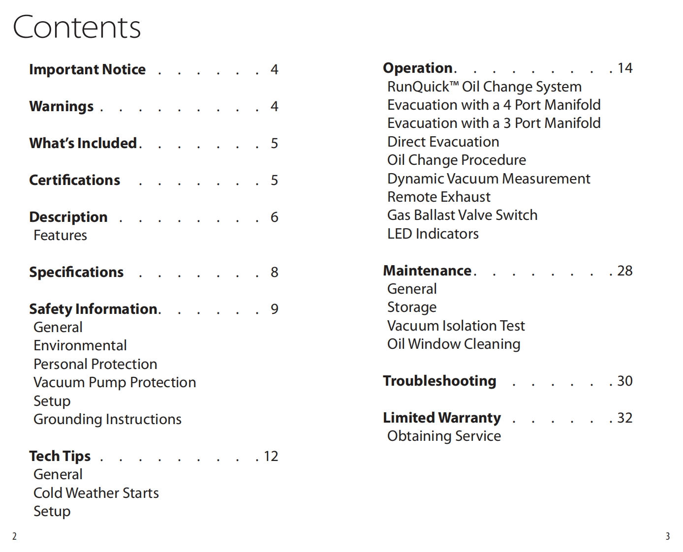 使用操作说明书手册-VP67-VP87-VPX7-v06348072@abc4个月前发布关注私信2.03MB18页047使用操作说明书手册-VP67-VP87-VPX7-v06此内容为付费资源,请付费后查看¥18¥19黄金会员免费钻石会员免费立即购买您当前未登录!建议登陆后购买,可保存购买订单付费资源 第1页 / 共18页 第2页 / 共18页 试读已结束,还剩16页,您可下载完整版后进行离线阅读 THE END说明书手册 文本预览 Fieldpiece.Vacuum Pumpwith RunQuick"MOil Change SystemOPERATOR'S MANUALModels VPX7,VP87,VP67,VPX7UK.VP87UKRunQuidi Change System⊙10 CFM Dual Stage Vacuum PumpFieldpiece.vPxFieldpieceFieldpiece 查看更多 收起部分 喜欢就支持一下吧收藏