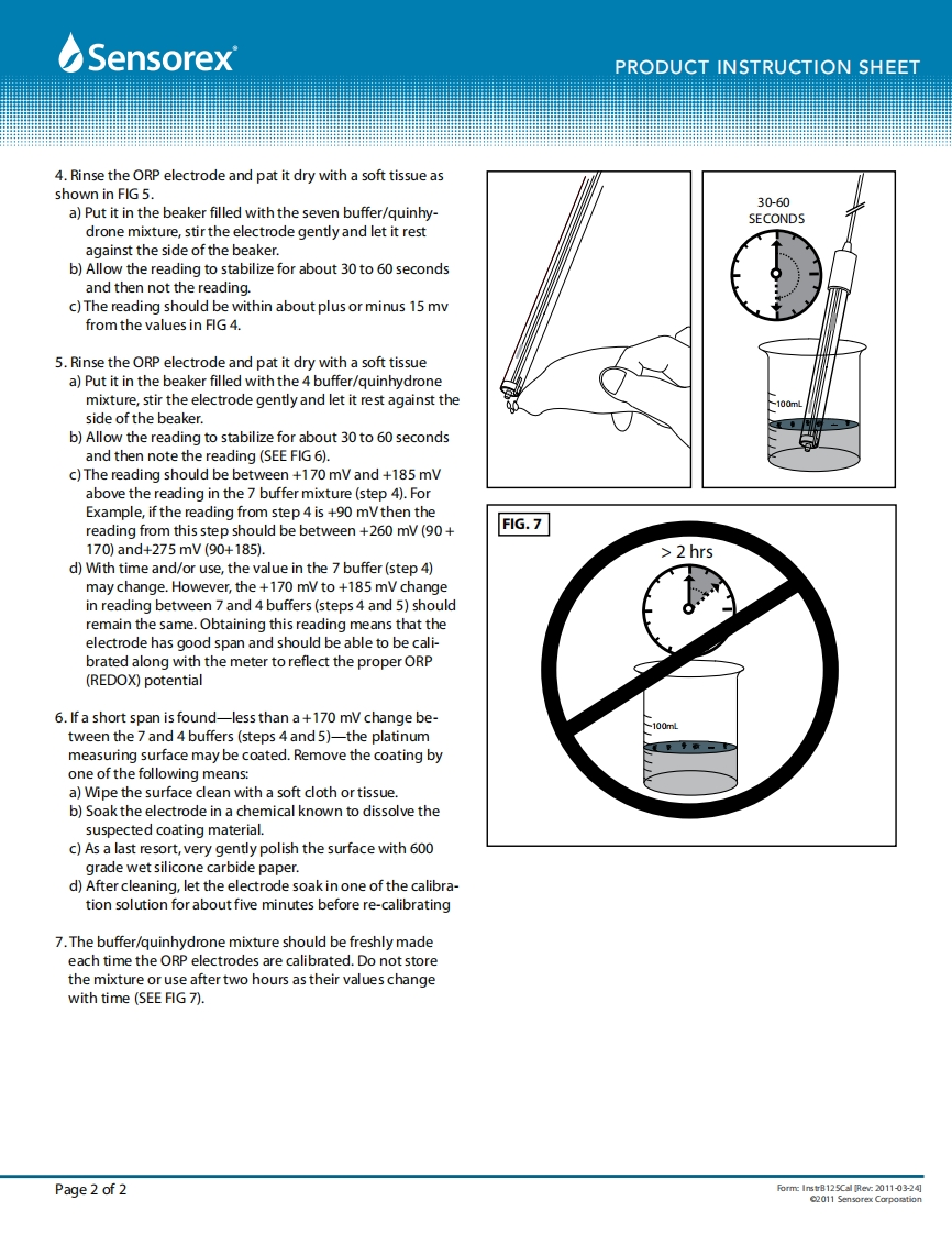 SensorexPRODUCT INSTRUCTION SHEETB125 ORP Calibration KitProduct InstructionsIntroductionThe performance of an ORP electrode can be determined byFIG.1use of the ORP Calibration Kit and the procedures given below.The Calibration Kit can be used for about 30 two-pointcalibrations.Quinhydroneapprox 1/4"onItems Includedwooden stickItemQuantitypH 4.01 buffer1 pintpH 7.00 buffer1 pintquinhydrone powder20 gramsplastic beakers(150mL)3 eachwooder applicator sticksapprox 50Preparation1.Fill a beaker with de-ionized or distilled water to use forFIG.2FIG.3rinsing the electrode.undissolved2.Fill a second beaker to the 1/2 oz mark with pH 7 buffer.quinhydronea)To this buffer add the amount of quinhydrone that stayson about 1/4 inch(6 mm)of the wood applicator(seesketch).b)Use the wood applicator to stir the quinhydrone into thebuffer.c)A small amount of quinhydrone MUST remain undis-solved;if all the quinhydrone dissolves add a small100mL0mamount and stir.Repeat as necessary until a small amountof quinhydrone remains un-dissolved.3.Fill a third beaker to the 1/2 oz mark with pH 4 buffer.a)To this buffer add the amount of quinhydrone that stayson about 1/4 inch(6 mm)of the wood applicator(SEE FIG 1).b)Use the wood applicator to stir the quinhydrone into theFIG.4buffer (SEE FIG 2).PLATINUMORP ELECTRODE IN 7 BUFFER/QUINHYDRONE MIXTUREc)A small amount of quinhydrone MUST remain un-Temperature20C(68F)25C (77F)30C(86Fdissolved;See FIG 3 if all thequinhydrone dissolves addReadings (mV)8910783-10176-94a small amount and stir.Repeat as necessary until a smallReadings (pH)520-5.505.30-5605.42-5.72amount of quinhydrone remains un-dissolved.PLATINUM ORP ELECTRODE IN 4 BUFFER/QUINHYDRONE MIXTURER(V)20C(68F)25C77F)30C(86F260-287254-281247-274Readings (pH)2.15-2.602.25-2.702.37-2.82Parts covered by this product data sheet include:B125Page 1 of 2Form:InstrB12SCal [Rev:2011-03-24]2011 Sensorex Corporstion
