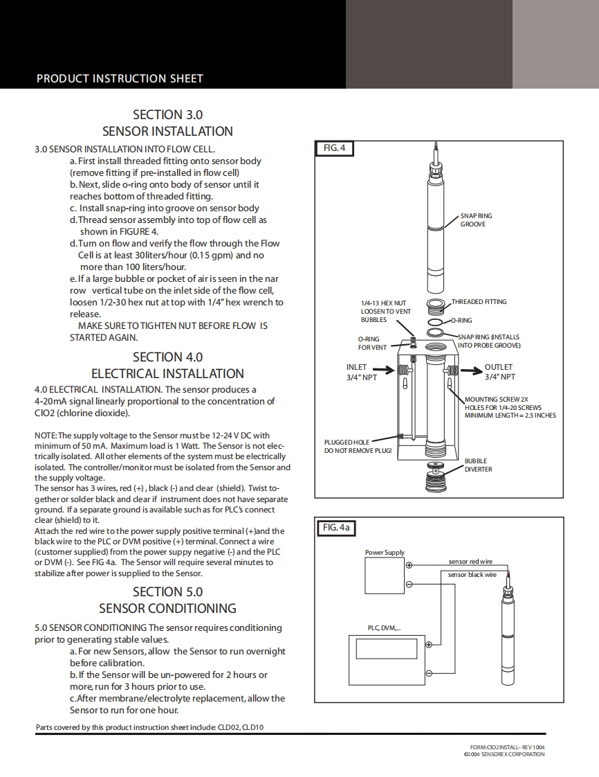 PRODUCT INSTRUCTION SHEETChlorine Dioxide SensorsSECTION 1.0FIG.1INTRODUCTION1.0 CHLORINE DIOXIDE SENSOR ASSEMBLY.The ChlorineDioxide Sensor is shipped with the membrane cap and electro-lyte separate.1.1 Open the Bottle of Electrolyte:a.Wear gloves and safety glasses during assembly ofthe sensor since the electrolyte is a STRONG ACID.b.After using,re-cap the electrolyte until thenext use.1.2 Membrane Cap Assembly:a.Remove the membrane cap from theSensor's body as shown in FIGURE 1.FIG.2b.Fill the membrane cap up to the top withelectrolyte as show in FIGURE 2.c.Hold the Sensor's body vertically andscrew the membrane cap onto the Sensor'sbody.Some electrolyte will be displaced out of thecap as shown in FIGURE 3.Screw the membrane capuntil it is hand tight on the body.d.Rinse the Sensor with running water andwash your hands.e.NOTE:IF ELECTRODE IS STORED DRY OUT OF FLOWCELL AND WATER OR SALT CRYSTALS ARE SEEN ONMEMBRANE OR WHERE CAP THREADS ONTO BODY ALEAKIS PRESENT.REPLACE CAP AND ELECTROLYTEBEFORE INSTALLING INTO FLOW CELL.SECTION 2.0FIG.3FLOW CELL INSTALLATIONSNAP RING2.0 FLOW CELL.To obtain accurate Chlorine Dioxide read-GROOVEing,the Sensor must be installed into the Chlorine DioxideFlow Cell to prevent air bubbles formation on the membrane,proper spacing between the sensor and the installation wall,and laminar flow across the membrane.2.1.Using two 3/4"NPT Tube/pipe fittings or pipe nipples,connect the Flow Cell into your system,noting the inlet andoutlet orientation.INLET SIDE is side of flow cell with thin tube(see FIGURE 4)Parts covered by this product instruction sheet include:CLD02,CLD10FORM-CO2INSTALL-REV100402004 SENSOREX CORPORATION