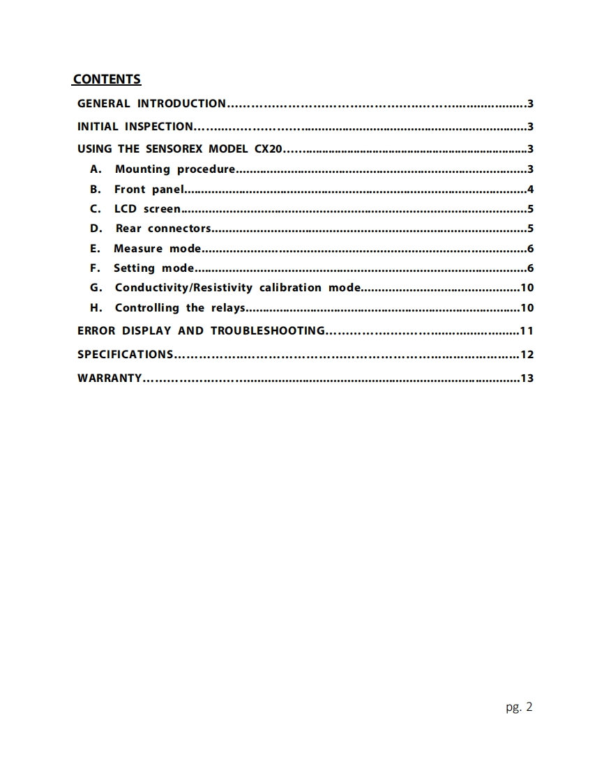 使用说明书手册CX20348072@abc4个月前发布关注私信0.27MB13页027使用说明书手册CX20此内容为付费资源,请付费后查看¥18¥19黄金会员免费钻石会员免费立即购买您当前未登录!建议登陆后购买,可保存购买订单付费资源 第1页 / 共13页 第2页 / 共13页 试读已结束,还剩11页,您可下载完整版后进行离线阅读 THE END说明书手册 文本预览 Operation ManualCX20 1/8 DINMicrocomputer Based Conductivity/Resistivity ControllerSensorexMODE1.03mSENTERCX20 CONDUCTIVITY CONTROLLERSensor1751 Markon DriNe Garden Grove,CA.2841U.S.A.pg.1 查看更多 收起部分 喜欢就支持一下吧收藏
