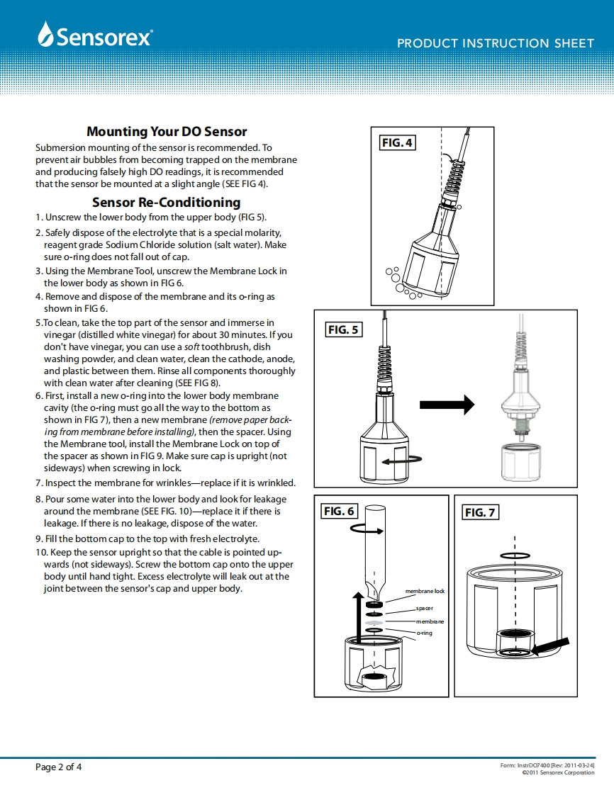 SensorexPRODUCT INSTRUCTION SHEETDissolved Oxygen Sensor Care and Use InstructionsProduct InstructionsIntroductionYour Dissolved Oxygen(DO)sensor is a galvanic electrochemi-FIG.1cal device;i.e.it does not require power from your meter orcontroller to generate its signal.The DO sensor will provide amillivolt signal proportional to the concentration of oxygenin the water(model DO7400,DO7400TC)or 4-20mA currentoutput(models DO7441 and DO7442).The signal outputis proportional to ppm of oxygen for probes with millivoltsignal output or changes linearly with ppm of oxygen sensorswith 4-20mA output.The partial pressure of oxygen,which isdirectly proportional to the percent saturation of oxygen in aspecified sample,can be calculated based upon the oxygensolubility which is a function of temperature,salinity,totalatmospheric pressure,etc.Your Dissolved Oxygen sensor consists of an cathode,anodeand an electrolyte separated from your process fluid by an oxy-gen permeable membrane.The oxygen passing through themembrane reacts at the cathode,giving up electrons,whichproduces an electrical current.Electrical ConnectionsFIG.2DO7400 and DO7400TC models:Red wire of Sensor to DO input +(cathode)Black wire of Sensor to DO input-(anode)White and Green wires of Sensor to Temperature input(10k NTC)(See wiring FIG 2)DO7441 and DO7442 models:COLORFUNCTIONRed wire of Sensor to DO input+(cathode)RREDCATHODEBlack wire of Sensor to DO input-(anode)BBLACKANODE(See wiring FIG3)WHTETEMPERATUREGetting Your DO Sensor Ready to UseGGREENTEMPE RATUREYour DO sensor is shipped to you dry and is not ready for use.Seesteps 1,7,8,9 and 10 of the "Sensor Reconditioning"section ofthis sheet for instructions on sensor preparation.The installedFIG.3Power Supply⊕sensorredwiremembrane shipped with the probe is usable if it passes thesensorleak test in step 8.Maintenance items included with your sen-black wiresor include:one each membrane lock tool,ywo each Teflon orHDPE membranes,two each membrane o-rings and 250mL ofelectrolyte.CalibrationPLC,DVMThe simplest method to calibrate your DO sensor is to holdit in air.You may also bubble air past the sensor in water.Thesensor is pre-calibrated at the factory (see Specifcations Sec-tion for calibration range).If you want a two-point calibration,a saturated solution of sodium sulfite(NazSO3)is suggested.17g Sodium sulfite in 125mL DI water is more than enough.Sodium sulfite will not reach a true zero output but it shouldreach less than 1 mV or less than 4.5mA in five minutes or less(See Specifications ection for range).Parts covered by this product data sheet include:D07400,D07400TCD07441,D07442Page 1 of 4Form:InstrD07400 [Rev:2011-03-24]2011 Sensorex Corporstion