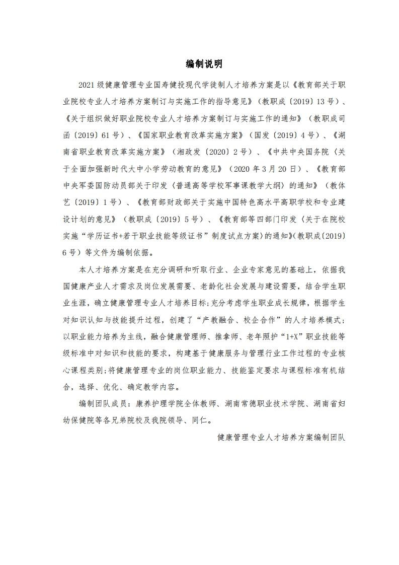 2021级健康管理专业(国寿健投)订单专业人才培养方案348072@abc4个月前发布关注私信2.80MB54页0282021级健康管理专业(国寿健投)订单专业人才培养方案此内容为付费资源,请付费后查看¥14¥18黄金会员免费钻石会员免费立即购买您当前未登录!建议登陆后购买,可保存购买订单付费资源 第1页 / 共54页 第2页 / 共54页 试读已结束,还剩52页,您可下载完整版后进行离线阅读 THE END管理学类绩效考核规章制度 文本预览 中国人寿保险只业学院CHINA LIFEINSURANCE PROFESSIONAL COLLECE保险职业学院专业人才培养方案专业(方向)名称健康管理所在系院康养护理学院专业教研室基础医学教研室专业(方向)带头人刘丽现代学徒制合作企业中国人寿健康产业投资有限公司 查看更多 收起部分 喜欢就支持一下吧收藏