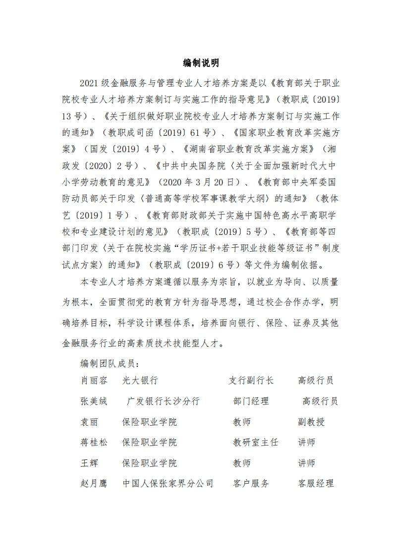 2021级金融服务与管理专业人才培养方案348072@abc3个月前发布关注私信2.71MB59页0372021级金融服务与管理专业人才培养方案此内容为付费资源,请付费后查看¥14¥18黄金会员免费钻石会员免费立即购买您当前未登录!建议登陆后购买,可保存购买订单付费资源 第1页 / 共59页 第2页 / 共59页 试读已结束,还剩57页,您可下载完整版后进行离线阅读 THE END管理学类绩效考核规章制度 文本预览 中国人寿保险只业学院CHINA LIFEINSURANCE PROFESSIONAL COLLECE保险职业学院专业人才培养方案专业(方向)名称金融服务与管理所在系院金融系专业教研室金融教研室专业(方向)带头人蒋桂松制定时间2021年7月修订时间2021年8月(第2次修订) 查看更多 收起部分 喜欢就支持一下吧收藏