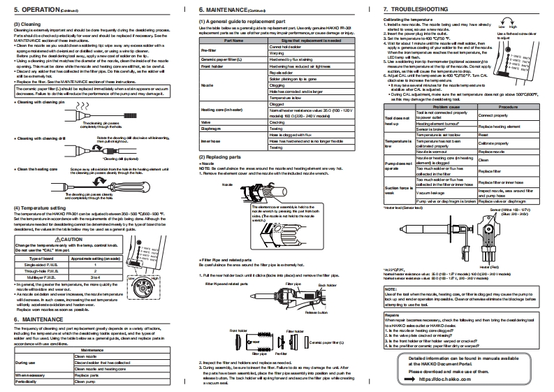 @HAK③O3.WARNNGS AND CAUTIONS4 PART NAMESHAKOFR-301Warnings and causions are placed at escal points in this manual toDesoldering Tooldiseet the o perator's amenion to significant items.They are d dfined aslollows:Instruction Manual么WARNING:Failue to comply wimh a WARNING may resu直i自hark you fe purchsng起KOFR-01 Dosddai年Tededous in中ry or death垂d由smunal bfos单通gt风成OR0Lae如单smuraul nadly ac of obla每■么CAUTION:Failuse to comply wi当a CAUTION may resut in injuryto the operatoror damage to the items imroled1.PACKING LISTAND PART NAMESPheae chechto mle aure tat hems btedbelowan indudedin te pad o.4#D用0,lcontold_.WARNINGCg业pr雀g以一Cimning Pin [oret anm0 tin noo钟-出e0Fm4H国Whan power is ON the nozde wll be hot To avoid injury or damageto perso nnd anditems in the work anea.observe the following:.Do not touch the nozze or the metal parts near the nozzle.Do not allow the nozde to come close to.or touch.fl ammable.Infomm others in the area that the unit is hot and should not be.Remorethe power plug whan not in use.or ldt unatended..Turn the po wer off when connectingthe HAKKO FR301..This applance can beused by childran aged tom yoars and5.OPERATIONabove and persons with redu ced physical,sensory or mentalHwDF升1capabilises or lack of experiance and knowledge I they have△CAUTIONb6tn9中en supervision o厘n星我etion concerning use of theThe temp erature of the nozzle end ditlers depending on the type ofappliance in sate way and understand the hazaeds involved.nozzles.2.SPECIACATIONSCalibrate the nozze temperatuse by adjus Sing the CAL to ensue:C边m should be supervised to ens出e that they d的not playoptimal performance.wth the appliance.P星tt4e件E到Cleaning and user main tan ance shall not be made by childen1)hepa5o道wthout supervision.TI LA.If the power cord is damaged it must be seplaced by theLWd女由timin南nti the nor由dimel ao,n ap ply a gnerous coning dfuuH学EoCC元INcQ7)w2H3man山cue,指servte ag罐ogsa山qualfied person inyar older o te endof.norder to avoid personal injury or damage to the unitEe出aneaama2)DesoldedngACAUTION白prevent accidents or damage to the HA3K0F讯-3,be sure toerve the followingwauw4 n eudng d ementand neplce睡它CAUTION罐nC泰ay.Do not use the unt for applications other than desoldedng.1.Plcs te narais over the lud wire of the part tobe.Do not strike the handpiece against hand objects to removeBe the lad wire and he not theexcess solder.This wil damage the handpiece..Do not modity the HAKK0F讯-30Lndmay cuae he lnd日penloft You.Use ony genuine HAKKO replacement parts.mal aount of出r如brm a heut白d第如hphohauting prooa.仓HAK☒o.Do not allow the HAKKO FR-301 to become wet or use it whenhands ane wet2Chdk女e ureal of te出onthe pinthu年Be刻e to hold the山g whan insering or semoving thenta过且4ahandpiece and power cords.Wththe norle inplacs our he lod wire,ouly年Be sune the work area is well ven建d.Sold ering produces0h是.If the pump does not opemte,immediatdy clean the nozde andheater#W雀ing e HAKKO FR-,d的n酒g whch mayMake ure tut a flter hu beeninerind in thecause bodily harm or phrysical damage.eed中线m