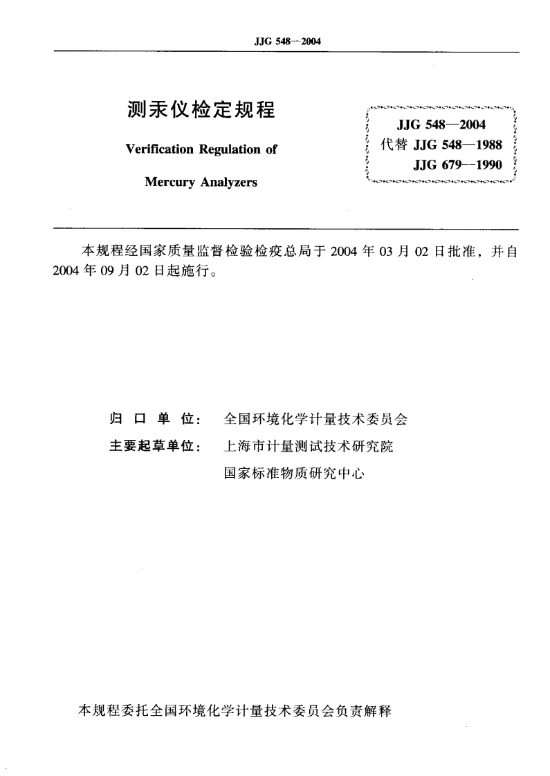 JJG548-2004测汞仪348072@abc3个月前发布关注私信0.24MB14页04615JJG548-2004测汞仪此内容为付费资源,请付费后查看¥17¥22黄金会员免费钻石会员免费立即购买您当前未登录!建议登陆后购买,可保存购买订单付费资源 第1页 / 共14页 第2页 / 共14页 试读已结束,还剩12页,您可下载完整版后进行离线阅读 © 版权声明文章版权归作者所有,未经允许请勿转载。THE END标准规范 文本预览 可JG中华人民共和国国家计量检定规程JJG548-2004测汞仪Mercury Analyzers2004-03-02发布2004-09-02实施国家质量监督检验检疫总局发布 查看更多 收起部分 喜欢就支持一下吧点赞15 分享QQ空间微博QQ好友海报分享复制链接收藏