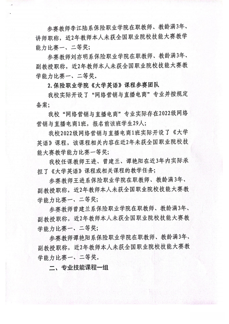 2023年“楚怡杯”湖南省职业院校教师职业能力竞赛教学能力比赛保险职业学院参赛团队信息公示依据《2023年“楚怡杯”湖南省职业院校教师职业能力竞赛教学能力比赛方案》关于参赛资格的相关要求,保险职业学院对7支参赛团队的参赛资格进行了审查,现公示如下:一、公共基础课程组1.保险职业学院《思想道德与法治》课程参赛团队我校实际开设了“智慧健康与养老服务”专业并按规定备案;我校“智慧健康与养老服务”专业实际存在2022级智慧健康与养老服务2班,报名前该班学生37人;我校2022级智慧健康与养老服务2班实际开设了《思想道德与法治》课程;该课程相关内容在近2年未获全国职业院校技能大赛教学能力比赛一等奖;我校任课教师何俊、石丽芹、李江陆、刘亦明在近3年内实际承担了《思想道德与法治》课程或相关课程的教学任务;参赛教师何俊系保险职业学院在职教师、教龄满3年、副教授职称,近2年教师本人未获全国职业院校技能大赛教学能力比赛一、二等奖;参赛教师石丽芹系保险职业学院在职教师、教龄满3年、高级政工师职称,近2年教师本人未获全国职业院校技能大赛教学能力比赛一、二等奖;
