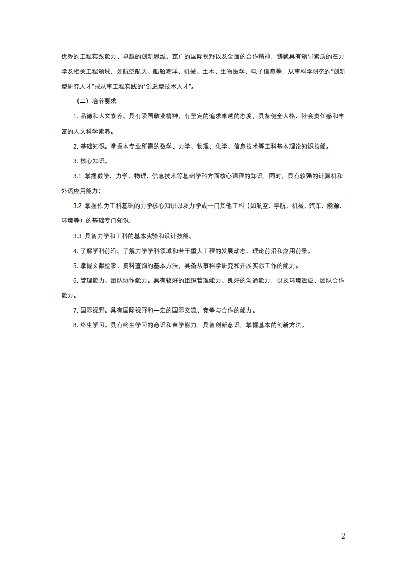 力学与航空航天工程系理论与应用力学专业本科人才培养方案(2023级)一、专业介绍南方科技大学为国家教育改革实验院校,以理、工学科为主,兼具部分特色人文、管理学科,在本科、硕士、博士多层次上办学,借鉴世界一流大学办学模式,建成国际化、创新型、高水平的研究型大学。基于国家重大战略需求,完善我校理工科人才培养体系,我校于2015年12月成立了力学与航空航天工程系。目前,我系已引进一批国内外知名学者和青年人才,形成一支年龄结构合理、知识结构互补、理论与实践并重的国际化教师团队。目前,力学与航空航天工程系有专任教师32人,其中教授15人,副教授9人,助理教授8人;专任教师有中国科学院院士2人,中国工程院院士1人,加拿大两院院士1人,澳大利亚工程院院士1人,国际会士11人。现有教员均具有海外(境外)学习或工作的经历,多数拥有丰富的教学和科研经验,视野开阔、知识渊博、责任心强,是一只完全能够胜任本专业教学、实习和指导学生毕业论文(设计)任务的国内少有的优秀教师团队。理论与应用力学专业是一门具有较强理论与应用结合的基础科学,也是现代科学技术中一门历史悠久、发展迅速、应用广泛的专业,具有技术科学类的特点,其专业知识结构是许多产业和各类工程学科的理论和技术基础,比如航空航天、海洋、机械制造、土木建筑、天体力学等领域,是一个培养既能纵览技术发展全局又能克服攻坚的科研和技术人才的摇篮。力学与航空航天工程系全体师生力争通过6年的努力,建成一个国际化程度高、具有鲜明特色的理论与应用力学本科专业,使本系专业成为一个具有世界一流水平的、以"产学研"模式为中心的、与中国航空航天产业和国家重大需求紧密联系的高水平学科。专业类:力学类;专业代码:080101。二、专业培养目标及培养要求(一)培养目标理论与应用力学专业培养掌握力学的基本理论、基本知识和基本技能,能在力学及相关科学领域从事科研、教学、技术和管理工作的高级专业人才。力学是现代工程科学的基础,其理论和方法是推动众多工程科学创新和发展的原动力。力学专业强调理论和工程实际相结合,注重培养学生扎实的力学数学基础、1