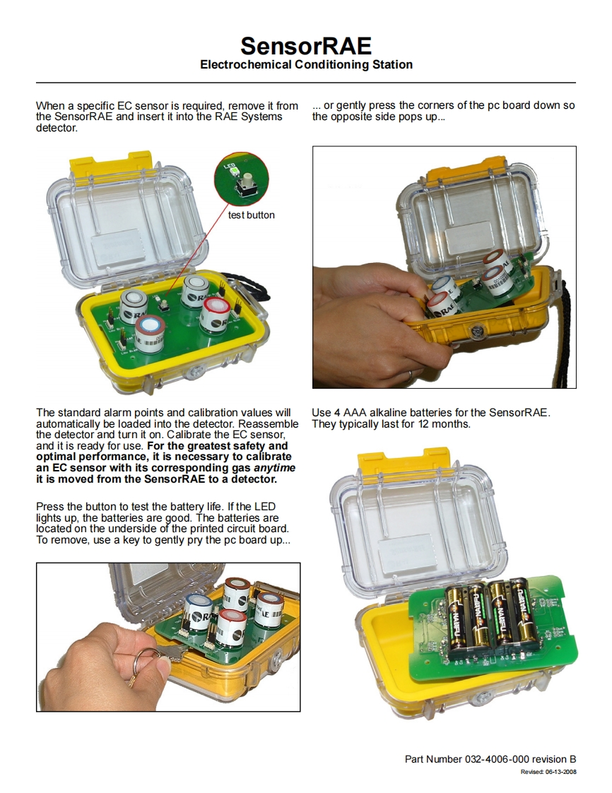 SensorRAEElectrochemical Conditioning StationUser's GuideThe SensorRAE is a 4-socket electrochemical(EC)sensor conditioning station that keeps RAE SystemsEC sensors ready for immediate use while they arenot installed in a RAE Systems multi-sensor product.EC sensors must reach an electrically stable stateto provide accurate,reliable performance.While itRAESensorRAEtakes less than an hour for a CO sensor to stabilize,it.comtakes at least 24 hours for a NH,sensor.SensorRAEmaintains sensors in a ready-to-use state.(Referto RAE Systems Technical Note TN-114 for moreinformation.)FeaturesPractical:Users with just one multi-sensor detectorcan have a complete suite of RAE Systemselectrochemical sensors ready to go.Convenient:The SensorRAE holds four easy-to-plug-in sensors at a time and is suitable for both low biasand high bias (NH NO)sensors.Durable:The sensors are protected in a rugged,compact,waterproof Pelican TM case with atransparent lid.Low-Maintenance:Four AAA batteries powerthe SensorRAE for at least 12 months and theconditioning station also includes a battery test buttonwith an LED indicator.SpecificationsSize:5.4”×4.0”×2.1”(13.7×10.2×5.3cm)Weight without sensors:10 oz(285 g),with batteriesRA里Power:4 AAA alkaline batteriesRating:WaterproofS Y S T E M Sby HoneywellSupports the following RAE Systems Products:RAE Systems by HoneywellMultiRAE PlusContact InformationMultiRAE-IRMain Office 3775 N.First StSan Jose,CA95134,USAAreaRAE,AreaRAE Gamma,and AreaRAE IAQTelephone 408.952.8200SentryRAETol-Free877.723.2878VRAEFax408.952.8480QRAE PlusEmail RaeSales@raesystems.comIAQRAEWebsite www.raesystems.comTechnical Support 888.723.4800Use with Rae Systems'Electrochemical Sensors:Tech@raesystems.comCO,H,S,SO,NO,NO,Cl,HCN,PH and NH