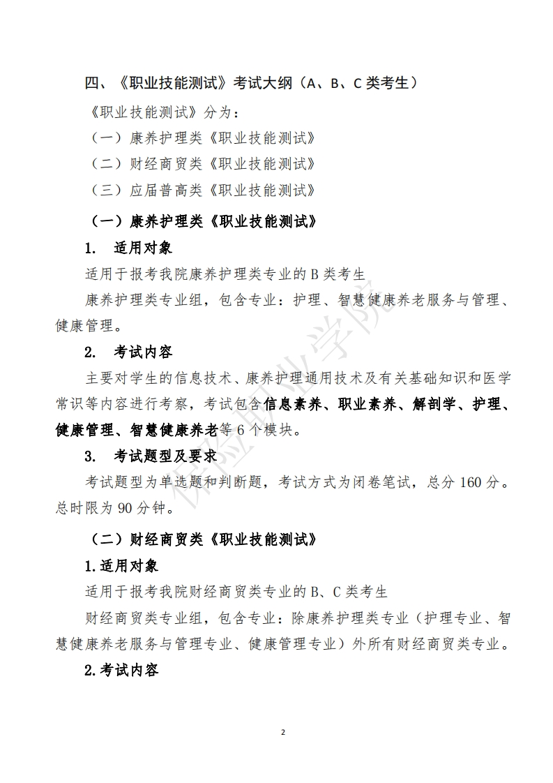 2023年保险职业学院单招考试大纲一、单独招生考试分为以下三类考生A类:应届高中毕业生B类:中职、往届普通高中考生、同等学力考生C类:退役军人二、单独招生考试分为以下三种考试方式1、《文化素质测试》(闭卷笔试)2、《职业技能测试》(闭卷笔试)3、《职业技能测试》(面试)三、《文化素质测试》考试大纲(B类考生)1.适用对象适用于报考我院所有需要参加《文化素质测试》的B类考生。2.考试内容《文化素质测试》考试分为语文、数学、外语3个科目。根据《中等职业学校公共基础课课程标准》及高中阶段语文、数学、外语科目的基础知识单独组织闭卷考试。3.考试题型及要求语文:考试题型为单选题、阅读理解、微写作,考试方式为闭卷笔试。总分100分。数学:考试题型为单选题,考试方式为闭卷笔试。总分100分。外语:考试题型为词汇填空、语法填空、阅读理解,考试方式为闭卷笔试。总分100分。三门课程一套试卷,总时长90分钟。