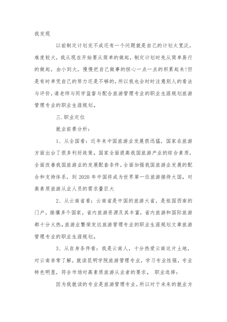 关于旅游管理专业的职业生涯规划范文一.前言时光如白驹过隙,从刚进校时见人就叫学姐/学长,到现在成为了大一新生的学姐,我才发现我的大学生活已过半,但我对于未来、对于就业却是一片茫然,于是我决定结合自身实际制定做出明确的规划。二.自我分析一直以来,我都生活得无忧无虑,家庭条件虽然谈不上十分宽裕,但也可以让我衣食无忧,过去的我几乎从不为自己的未来过于担忧,总是觉得就业距离自己太遥远。但是眼看身边越来越多的前辈毕业后找不到工作,我才意识到就业的艰辛,我很有必要对自己进行一次全面的分析。通过进行自我分析,我得出以下结果:1、我的优点:性格开朗外向,思维活跃,善于思考问题,待人友善,交际能力好,态度乐观积极。2、我的缺点:说话太直,做事不仔细,恒心不足没毅力,对没兴趣的事态度懒散。3、生活中成功的经验:小学到大学多次担任班委,有丰富的经验;人缘好,朋友多,人脉广。4、自我完善:我深知人的性格一旦形成是很难改变的,但是如果想成为新世纪的人才我们就一定要克服重重困难,发扬自己的优势,改变自己的劣势,所以我下决心改掉自己做事恒心不足的缺点,