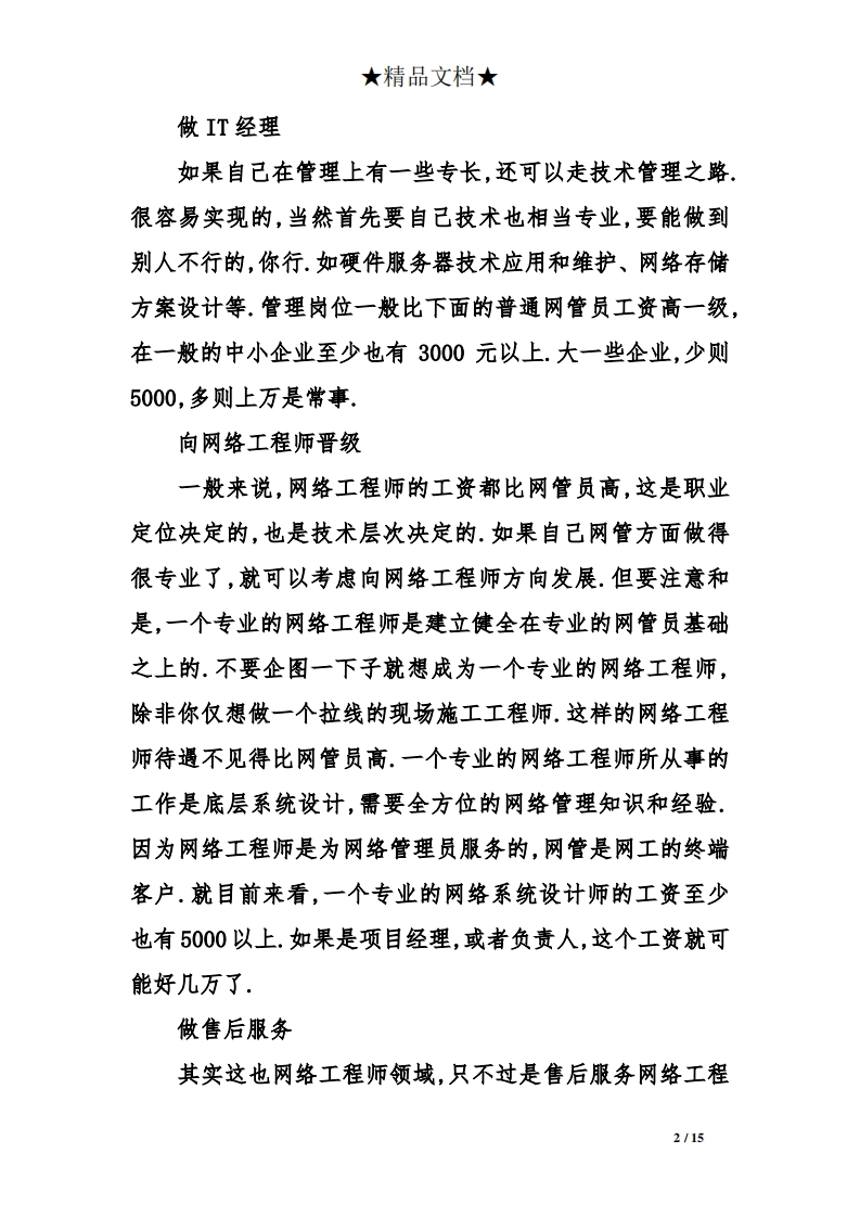 ★精品文档★关于网络工程师的职业规划及计划关于网络工程师的职业规划及计划经常有人问,做网管到底好不好?网络工程是有没有前途?还经常听到有网友说要转行,做网管太累,而工资又低,真是非常遗憾网络工程师职业规划过程主要有以下几步:两年以上的小型企业→四年左右的中型企业→大型企业或跨国集团公司第一步,小企业的网络管理员(系统管理员);第二步,进入大中型企业,同样的网络管理工作,工资就可能完全不同了,一般都在3000元以上.做了部门经理时,还可以高达5000元或以上;第三步,学习更全面的知识成为普通的网络工程师工资就高达3500元以上;第四步,学习更全面的知识成为专业的网络工程师,如网络存储工程师、网络安全工程师的工资就可以达8000元以上,做大型企业或专业网络公司IT经理的工资就更高了,基本在万元以上.做专业网管员有人觉得网管员就是低工资的代名词,其实是非常错误的.大公司的专业网管工资,少则4000、5000元,多则过万元,多的是.关键是看你的专业程度了.笔者以前所在NESTLE公司,好几年前网管员的工资就达到了这个数1/15