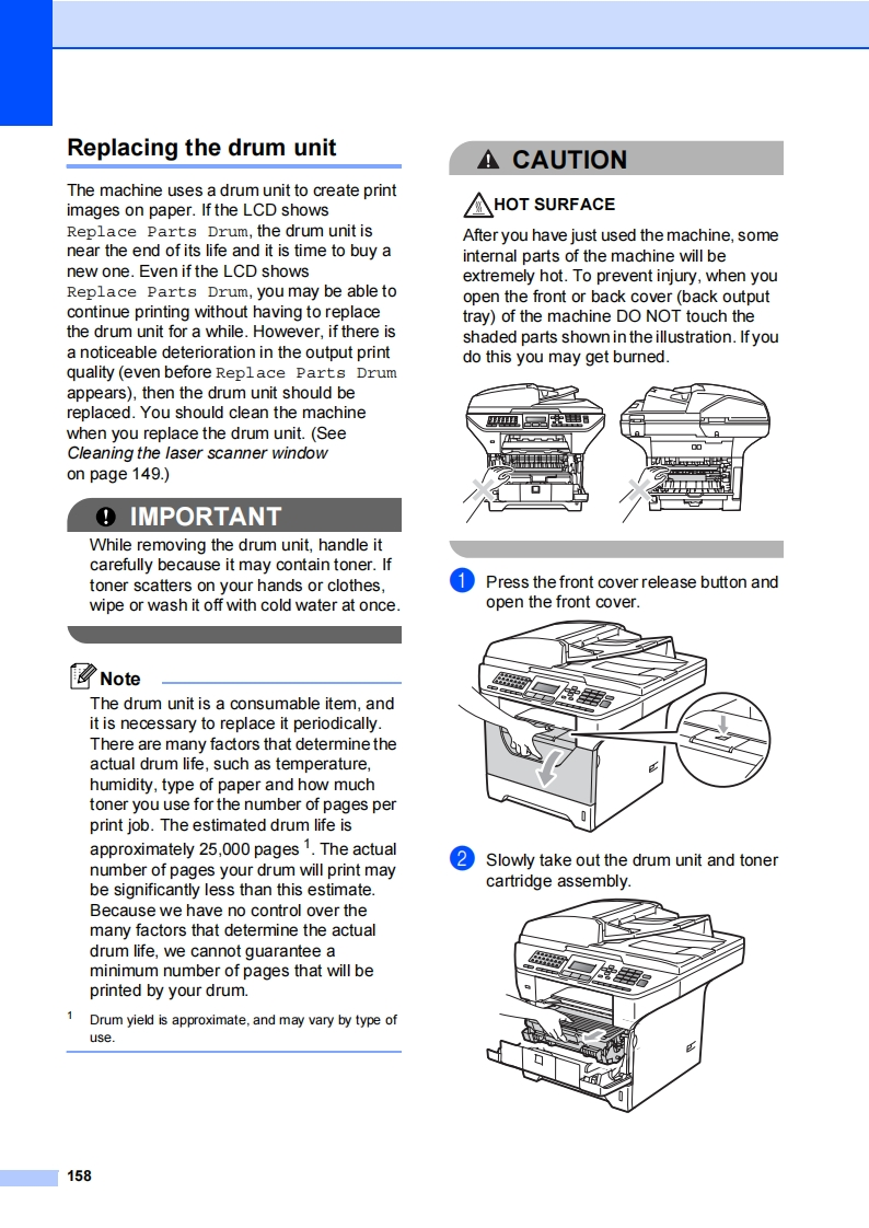 QualpathThe Way To The Digital OfficeREPLACING THE DRUM UNIT PLEASE READAttached are instructions on replacing your drum.Please pay particular attention to step number 8.By following this step it tells the machine you have put in a new drum.By doing this themachine stops calculating the remaining drum life on the drum you are about to replace.This step will prevent you from ordering additional drums unnecessarily because the machinebelieves there is little if any drum life remaining.If you have any questions please don't hesitate to call us at 866-851-2200.3710 Park Central Blvd.North,Pompano Beach,FL 33064Phone:866-851-2200Fax:866-422-9254www.qualpath.com