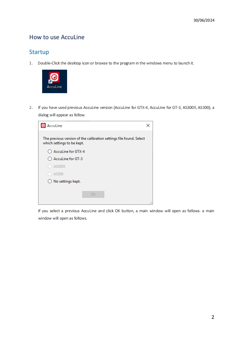 30/06/2024AccuLine-Users'GuideSoftware Version 5.0.0About Operating EnvironmentCompatible OS[GTX-4,GTX pro,GTX pro B,GTX-6,GTX-6 Extra Colors ORGR]Windows 10(64bit),Windows 11[GT-3]Windows 10(64bit)Min.Operating Environment[Common]CPU with 2 GHz or aboveRAM with 4 GB or aboveDisplay Resolution[Common]XGA (1024 x 768)or higherAvailable Printers●Brother GT-3●Brother GTX-4●Brother GTX pro/proB●Brother GTX-6Brother GTX-6 Extra Colors ORGRCombination of GTXpro printer driver and AccuLineGTXpro Printer DriverAccuLineVer.2.0.0Ver.4.2.0Ver.3.2.0Ver.5.0.01