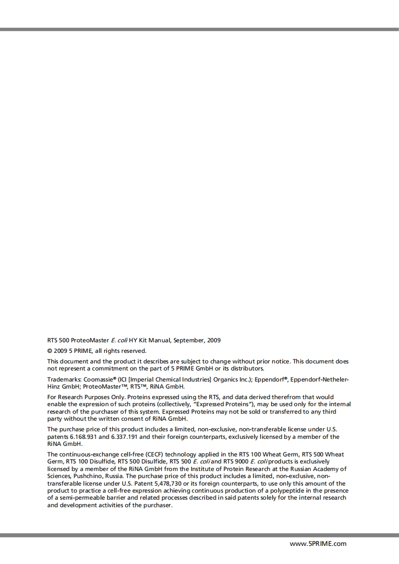 5prime-rts500-proteomaster-ecoli-hy-kit-_操作说明书手册348072@abc6个月前发布关注私信1.34MB40页0305prime-rts500-proteomaster-ecoli-hy-kit-_操作说明书手册此内容为付费资源,请付费后查看¥22¥33黄金会员免费钻石会员免费立即购买您当前未登录!建议登陆后购买,可保存购买订单付费资源 第1页 / 共40页 第2页 / 共40页 试读已结束,还剩38页,您可下载完整版后进行离线阅读 THE END说明书手册 文本预览 5 PRIMERTSTM 500 ProteoMasterTM E.co//HY KitManualFor medium-scale cell-free expression of protein from circularDNA templateswww.5PRIME.com 查看更多 收起部分 喜欢就支持一下吧收藏