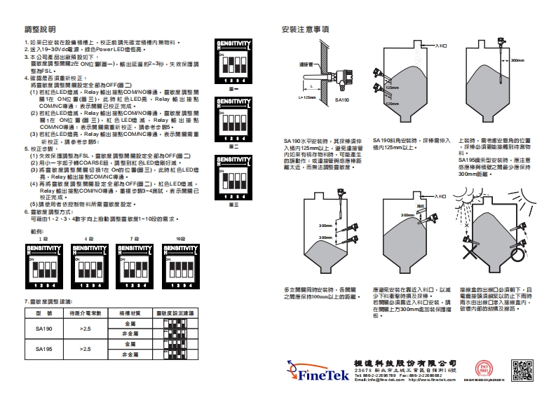 SA19多功能型静電容物液位開關操作說明功能介招LED增健指示失数预式物包幅出雪线Power SiG动作原理特點以被别物为介简·利用整酒棒慎测感题棒现桶■内置盒型接规盒,槽精小暂省安装空塑·型地魔围帽之麗名量·营整陋棒设物利覆蓝刚章章■19-30VdG供题夏·目有投色LED指示增9名量增加:罐到開黑内望规路酸定之霜名匹配方便客戶近现数横是否已通霜·FSH植特·橡路正生高桶腊握,格出借据信线,博成■PPS材简探棒,遇用龄酸跟境·0用限世作▣由使用老通用■具有SPDT裙图输出模式·■标出0一秒延置调竖·红色LED指示撞颗示状章·■使用4段指的式開微DIP Switch调竖豆取量·F8L■提供喜低位失数保题模式(F以/FSH)·章量源失双0①:霜源精入端子@:失效保模式机解⊙:接地摆子心:蚕取金调竖用保效:姐离0:姐酒©:输出接粘摆子③:延国输出调整复田=2R©:婴银指示增O:霜源指示撞CEbgRY)®:校正提出尺寸规格①①000供陋常源19-30Vda量测柜露E介霜常知2之5最敬盘10段存溫量.40-85C環境温量Rdh)接螺脱明PNP接擦期40-85℃操作量SA19处-40120℃環境/操作遥度限制SA19k40-85℃SA190:25Ba工作型力5A190SA195:6BSPDT Rday:5A/250Vac标出翻骏SA28VdaPNP transistor:300mA防调等极IP67(Aluminum housing)SA190SA195透用桃径第-10mm