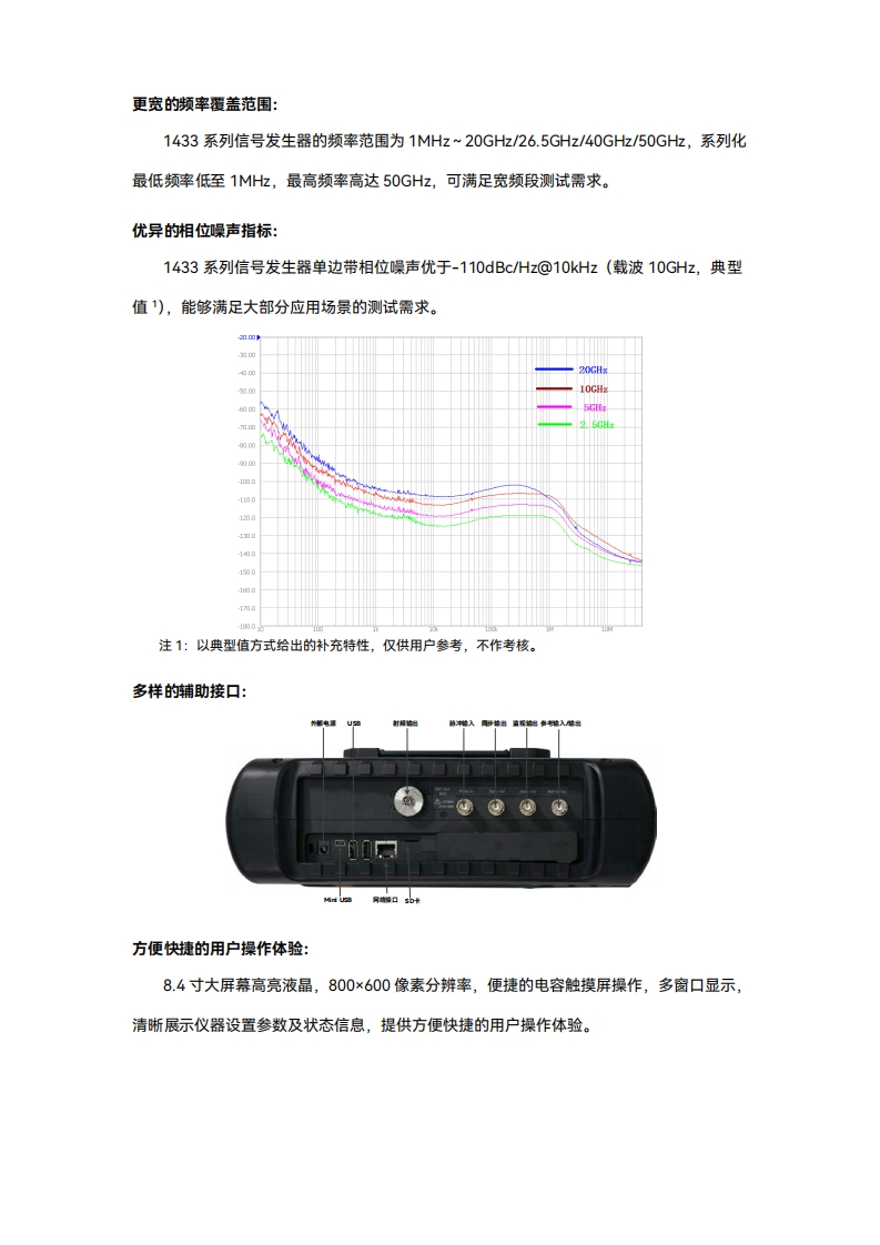 1433D/E/F/H信号发生器(1MHz~20GHz/26.5GHz/40GHz/50GHz)无过4拉1.000000000000e-120.005产品综述1433系列信号发生器是中电科思仪科技股份有限公司专为外场测试设计的一款手持式仪器,具有连续波信号输出、频率/幅度/脉冲/相位多种调制、大动态范围幅度调节、步进/列表扫描等功能,采用8.4寸大屏幕液晶及电容触摸屏一体化设计,方便用户操作。1433系列信号发生器具有体积小巧、供电灵活、环境适应性强等特点,非常适合现场使用。可应用于电子综合系统故障诊断、接收机性能测试、通信、导航等设备的外场安装、调试及日常维护保障工作。主要特点●更宽的频率覆盖范围:从1MHz覆盖到50GHz更高的频率分辨率:0.1Hz●优异的相位噪声指标:-110dBc/Hz@10kHz(10GHz载波,典型值1)●多样的辅助测试接口:参考输入/输出、脉冲输入、监视输出、同步输出方便快捷的用户操作体验:8.4寸大屏幕高亮液晶、便捷的电容触摸屏操作、液晶与触摸屏一体化设计●环境适应性强:工作温度范围为-10℃~50℃灵活的供电方式:可通过电池或电源适配器供电