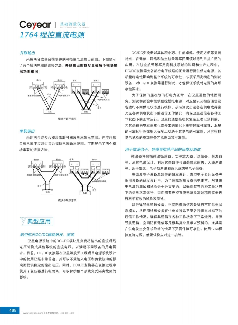 基础测量仪器Ceyear1764程控直流电源●串联并联输出功能●远端补偿功能●存储调用功能●电压、电流测量功能●过压过流等保护功能0.-1.6mA●外部触发同步控制功能●电压、电流序列输出功能●GPIB、LAN、USB接口功能本地/远地检测产品综述选用本地检测,电源的反馈取自输出连接器上的输出端子,这种方法忽略了负载线压降的损失,限制了电源的调整能1764程控直流电源是在自动测试环境中提供偏置和对部件力,负载引线越长、电阻越大,终端负载调整能力就越差,适或最终产品提供激励的理想设备。其广泛应用于军用和民用测用于对负载调整率要求不高的场合。选用远地检测,电源的反控系统、航空航天系统、船舶系统、工业检测与控制、集成电馈直接取自负载,电源电压的输出自动补偿负载引线的影响,路测试、PC主板测试及其他领域的复杂测试系统。在产品研使负载上的电压保持不变。制、生产和测试过程中,该产品能提供稳定的输出及快速动态本地检测和远地检测连接见示意图。响应速度,简化供电配置,缩短开发周期。该产品可替代进口仪器,满足各种加电测试需求。1764程控直流电源共含有6种电源模块,具有高达150V,50A和300W的输出能力。经济型电源模块可提供可编程的电压和电流,以及各种测量和保护特性,适用于为被测件本地补偿路线供电,或为自动测试系统和测试夹具控制提供电源,也可在研负载发中承担诸如直流偏置这类任务。低噪声高精度高性能自动量本地检测示意图程电源模块,其电压/电流变化速度要比其它可编程电源快10到50倍。在观察被测件(DUT)的电压/电流瞬态变化事件时,内置高速测试扩展软件功能提供类似高分裤率示波器的采样和显示,可简化系统配置和提高测量精度。自动量程输出能力让这远端补偿线样的一台电源能顶几台传统电源用。运端补偿线负载负载远地检测示意图主要特点说明:1)选用远地检测时,如果负载电压为额定值,模块实际输出电●高功率密度主机(1200W),多种电源模块方便选配,压可能会超出其最大输出范围,从而导致保护电路动作或者出单模块输出300W现输出失调状态。●适合于研发、设计验证和制造中的ATE系统2)选用远地检测时,通过检测线在模块输出上拾取的噪声将影●尺寸小:1U机箱空间中多达4路输出响负载调整率。为尽量减小噪声影响,应使用屏蔽双绞线将电源●改进吞吐率的快命令处理时间的检测线接到负载的电压检测端,屏蔽层的一端接至电源输出连●恒压恒流输出功能接器的接地端子上,另一端悬空。(不要使用屏蔽层作为检测线!)468Iwww,C0y9ar,c0m免费客眼电话:400I1684101