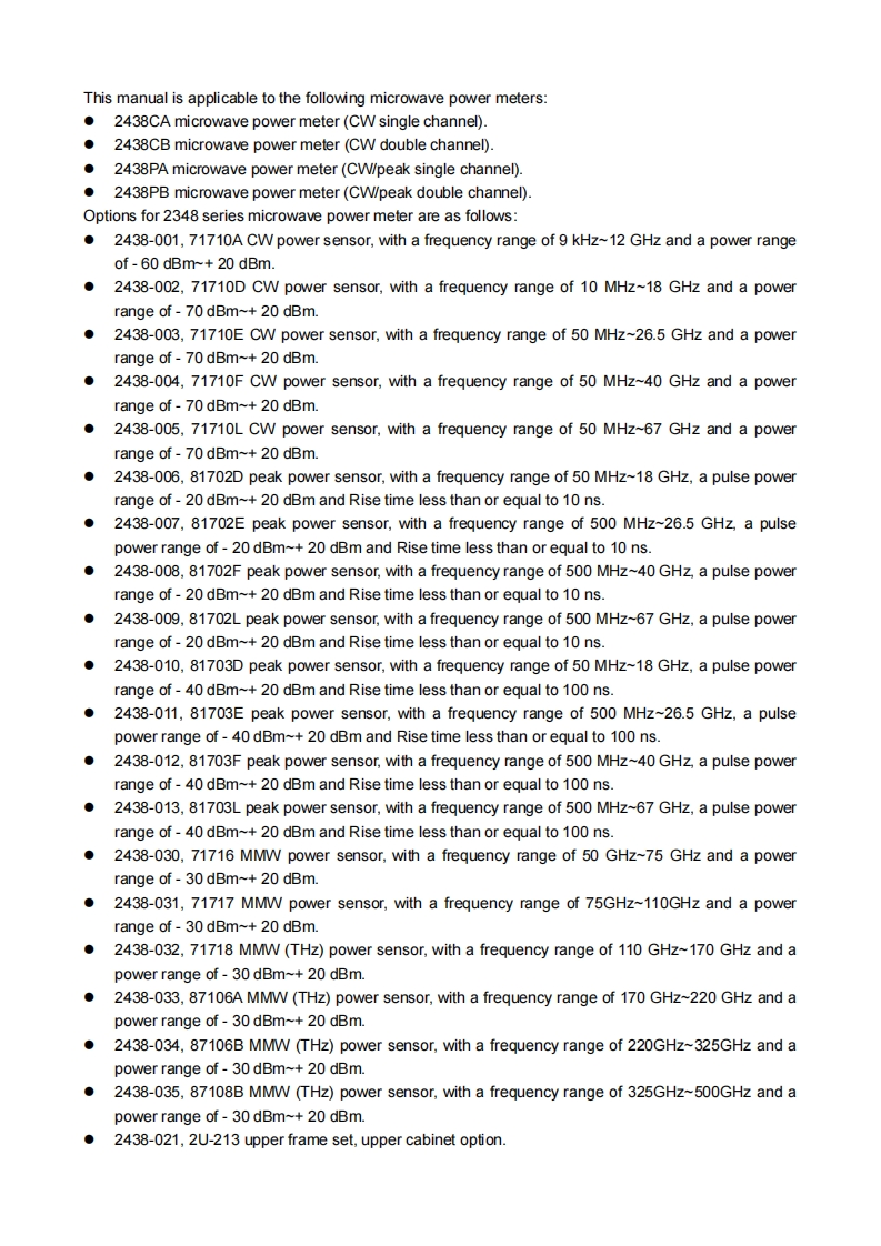 2438-Series-Microwave-Power-Meter-操作说明书手册348072@abc6个月前发布关注私信3.37MB145页0242438-Series-Microwave-Power-Meter-操作说明书手册此内容为付费资源,请付费后查看¥22¥33黄金会员免费钻石会员免费立即购买您当前未登录!建议登陆后购买,可保存购买订单付费资源 第1页 / 共145页 第2页 / 共145页 试读已结束,还剩143页,您可下载完整版后进行离线阅读 THE END说明书手册 文本预览 Ceyear2438 Series Microwave Power MeterUser ManualCALCeyear 2438PB Microwave Power Meter9omfet-cham-3.32dBmDManu ChanCalCeyear Technologies Co.,Ltd 查看更多 收起部分 喜欢就支持一下吧收藏