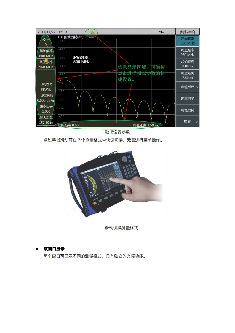 3680AVB天馈线测试仪(1MHz~4GHz/8GHz)产品综述3680A/B天馈线测试仪采用了先进的射频电路与数字电路混合集成设计技术、宽带基波混频技术、数字化中频处理技术。智能电源管理技术等新技术;具有测量速度快、测量精度高、体积小、重量轻、可电池供电、支持触摸屏操作、背光亮度可自动调节等优点,可对驻波比、回波损耗、特性阻抗和相位进行测试,对故障点定位。3680A/B天馈线测试仪针对现场测试而开发,主要用于各种通信基站天馈线系统的测试,包括集群、GSM、PCS/DCS、CDMA、GPRS、WCDMA、CDMA2000、TD-SCDMA、LTE及寻呼系统等。在天馈线系统安装、调试及日常维护时,天馈线测试仪可帮助用户快速评估传输线和天线系统的状况,提高运行基站的维护效率,加快新基站的安装调试进程。同时可用于科研、教学、生产中对射频器部件的反射参数测试。要特点支持多种测量格式支持回波损耗、驻波比、电缆损耗、DTF回波损耗、DTF驻波比、Smith圆图、相位共七种测量格式。可对电缆、天馈线系统进行全方位的测量及故障诊断。。支持触摸屏操作配备一款7寸液晶触摸屏,除了可进行菜单操作外,可触摸点击各种显示信息,进行快捷的参数设置。