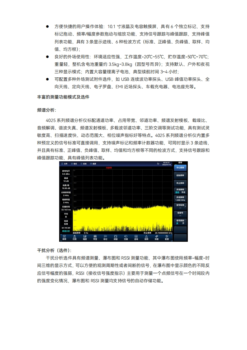 4025A/B/D/E/G/K频谱分析仪(9kHz~6/9/20/26.5/44/54GHz)产品综述Ceyear4025频谱分析仪系列化产品频率测量范围覆盖9kHz~54GHz,主要用于外场无线通信设备的安装调试、维护保障及干扰排查等场合,具有体积小、重量M轻、环境适应性强、供电灵活、操控方便等特点。4025系列频谱分析仪具有40MHz或120MHz带宽实时频谱分析、干扰分析、信道扫描、场强测量、USB连续波与峰值功率测量、模拟解调分析、Q分析、定向分析等多种测量功能模式,以及通道功率、占用带宽、邻道功率、频谱发射模板、载噪比、谐波失真、杂散发射模板、室内/室外地图覆盖等智能测量功能,支持LAN、USB、MicroSD卡、Wi-Fi无线通信等接口。整机采用10.1寸电容触摸屏,支持标记拖动、频率与幅度拖动缩放等功能,产品可应用于移动通信、卫星通信、微波通信设备的现场调试与安装维护、干扰源测向与地图定位、瞬态时变信号测试等领域。住要特点●频率覆盖范围:9kHz~54GH忆,低频可扩展至5kH2,标配全频段前置放大器●射频性能指标显示平均噪声电平≤-165dBm/Hz(2MHz~2GHz,前置放大器开,4025A/B/D典型值)≤-163dBm/Hz(2MHz~2GHz,前置放大器开,4025E/G/K典型值)单边带相位噪声:≤-113dBc/Hz@100kHz频偏@1GHz载波(典型值)≤-108dBc/Hz@100kHz频偏@10GHz载波(典型值)三阶交调失真:+16dBm@900MHz(典型值)总电平不确定度:±1.0dB(典型值)●扫描速度快扫描时间<33ms(扫宽20GHz,分辨率带宽3MHz)扫描时间<4s(扫宽1GHz,分辨率带宽1kHz,快速FT扫描方式)·多种测量功能模式:频谱分析、干扰分析(瀑布图、RSS)、信道扫描、场强测量、USB连续波功率测量、USB峰值功率测量、模拟解调分析(AM、FM、PM)、定向分析、40MHz/120MHz带宽实时频谱分析(支持数字余辉频谱和瀑布图显示)、2G/4G/5G解调分析、I1Q分析、时间门扫描等:多种智能测量功能:通道功率、占用带宽、邻道功率、频谱发射模板、载噪比、谐波失真、杂散发射模板、室内/室外地图覆盖等,支持GPS/北斗定位及对机内晶振的频率驯服校准功能,GPS锁定校准后的频率参考精度典型值可达到±1Oppb;多样的辅助测试接口及数字接口:1OMHz参考输入输出、GPS/北斗天线、零扫宽中频输出、Wi-Fi无线通信接口、LAN、USB、MicroSD卡等: