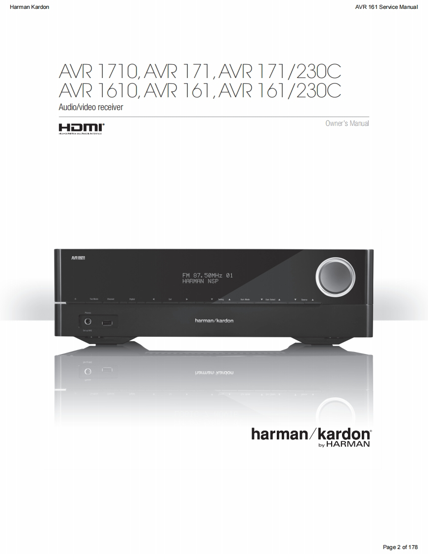 Harman KardonService ManualAVR161/2305.1 CHANNEL 85 Watt per channel AN RECEIVERR国FM 87.50MHz 01HARMAN NSPharman/kardonUSLJ9UKSLGOUCONTENTSFRONT PANEL CONTROLSREAR PANEL CONNECTORS35EXPLODED VIEW AND PARTS4BIAS ADJUSTMENT1REMOTE CONTROL FUNCTIONSPARTS LIST16PROCESSOR RESET9SEMICONDUCTOR PINOUTS0TROUBLESHOOTING10PCB DRAWINGS156SPECIFICATIONS11BLOCK DIAGRAMS165PACKAGE DRAWING12WIRING DIAGRAM166DISASSEMBLY1SCHEMATIC DIAGRAMS167Released EU2013Harman Consumer Group,Inc.Rev1.1,03/20168500 Balboa BoulevardNorthridge,California 91329