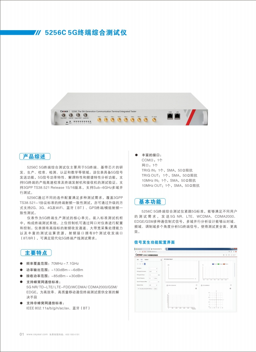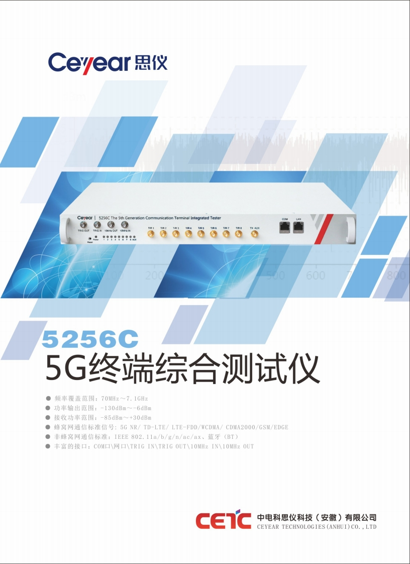 Ceyear思仪Ceyear 5256C The Sth Generation Communication Terminal Integrated Testerag目n9c299::a666666司656005256C5G终端综合测试仪●频率覆盖范围:70MHz~7.1GHz●功率输出范围:-130dBm~-6dBm●接收功率范围:-85dBm~+30dBm●蜂窝网通信标准信号:5GNR/TD-LTE/LTE-FDD/WCDMA/CDMA2O0O/GSM/EDGE●非蜂窝网通信标准:IEEE802.11a/b/g/n/ac/ax、蓝牙(BT)●丰富的接口:COM口网口TRIG INTRIG OUT10 MHz IN1 OMHz OUTCETC中电科思仪科技(安徽)有限公司CEYEAR TECHNOLOGIES (ANHUI)CO.,LTD