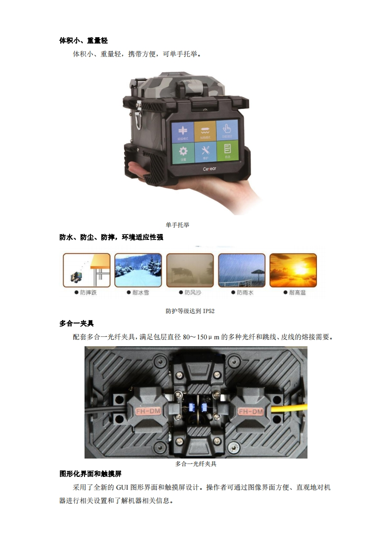 6481系列光纤熔接机产品综述迅6481系列光纤熔接机主要用于各类通信光纤光缆和掺铒光纤等多种光纤的接续和保护。产品强大的功能和超低的熔接损耗使其完全满足各种环境的光纤接续应用:产品的小型化与轻量化是本产品的主要特点之一:环境适应性强、可靠性高,防尘、防水、防摔:提供多种熔接模式和加热模式参数组,满足用户各种熔接需求:采用了高精度的陶瓷V型槽,使得放置光纤更加方便和准确,且便于清洁,维护更方便:具备双向熔接功能,带触摸屏的显示器,配以全新设计的图形化的菜单界面,方便用户熔接操作:大容量可插拔模块化锂电池为长时间野外工作提供了可靠保障:环境自动补偿系统大大提升了设备适应恶劣外界环境变化的能力,为在不同环境下获得低损耗接续的一致性提供了保证。主要特点·体积小、重量轻●7s快速熔接、15s高效加热(40mm细热缩套管)●5mm超短切割长度光纤熔接●300组熔接模式、100组加热模式、30000组熔接记录200幅图片·陶瓷V型槽、多合一夹具·自动熔接,智能热缩●USB和SD卡接口,U盘自动软件升级●内置模块化锂电池,熔接和加热循环至少220次GUI图形化界面及触摸屏设计,操作更简便·防尘、防水、防摔,环境适应性强