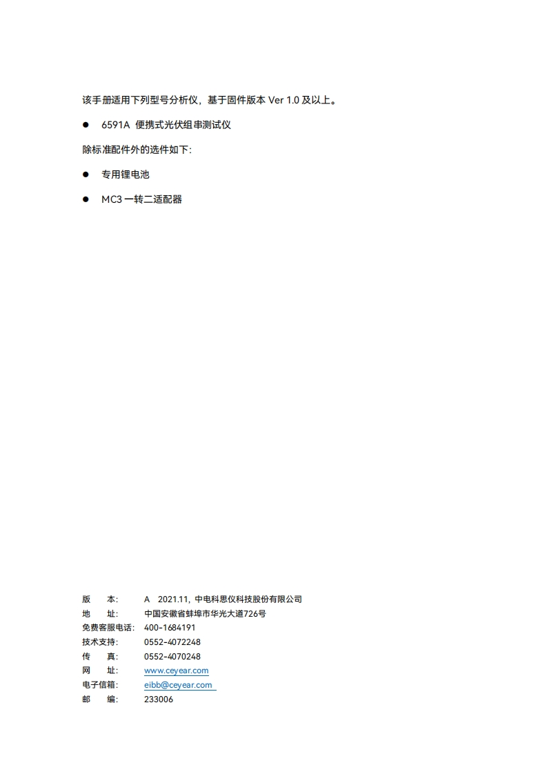 6591A便携式光伏组串测试仪用户手册348072@abc4个月前发布关注私信5.04MB67页0506591A便携式光伏组串测试仪用户手册此内容为付费资源,请付费后查看¥22¥33黄金会员免费钻石会员免费立即购买您当前未登录!建议登陆后购买,可保存购买订单付费资源 第1页 / 共67页 第2页 / 共67页 试读已结束,还剩65页,您可下载完整版后进行离线阅读 THE END说明书手册 文本预览 Ceyear思仪6591A便携式光伏组串测试仪用户手册中电科思仪科技股份有限公司 查看更多 收起部分 喜欢就支持一下吧收藏