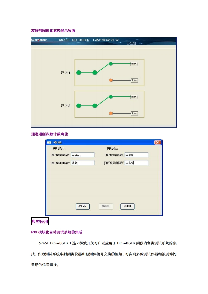6945FDC~40GHz1选2微波开关产品综述6945FDC~40GHz1选2微波开关集成2组SPDT开关,通道最高切换频率可达40GHz,具有插入损耗小、通道驻波比小、开关承受功率大、软件驱动标准规范等特点。该产品可广泛应用于雷达、通信、半导体自动测试系统中,实现系统内的微波通道切换。6945FDC~40GHz1选2微波开关采用人性化用户界面,使操作人员使用更方便,每一组开关操控具有独立性,图形化显示开关通道闭合状态,清晰明了。住要特点频率范围宽:DC~40GHz●友好图形化状态显示界面●软件支持CVI/VB/VC/LabVIEW等多种开发环境进行系统集成●软件驱动支持V-C规范软件支持国产操作系统具有通断次数计数功能